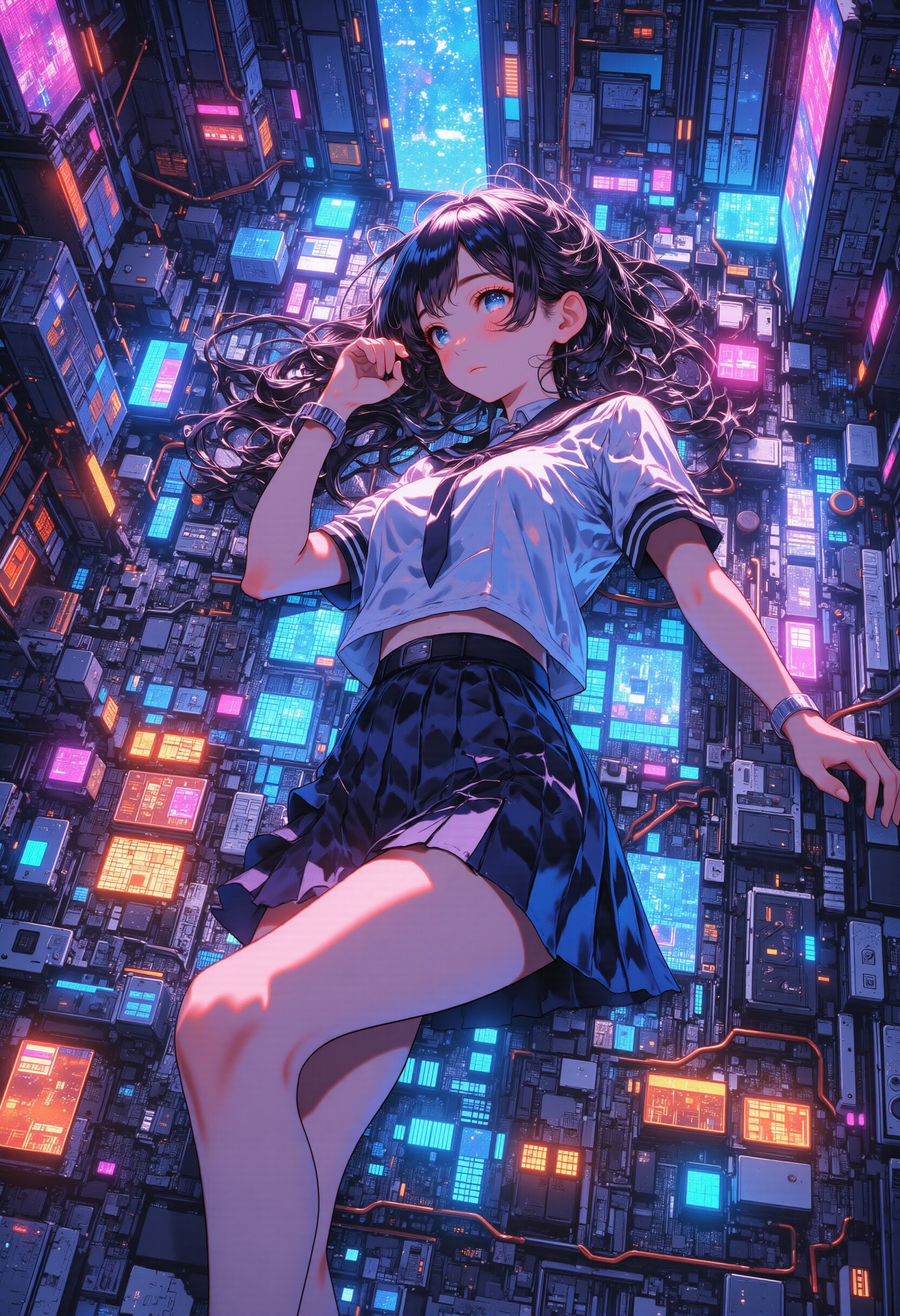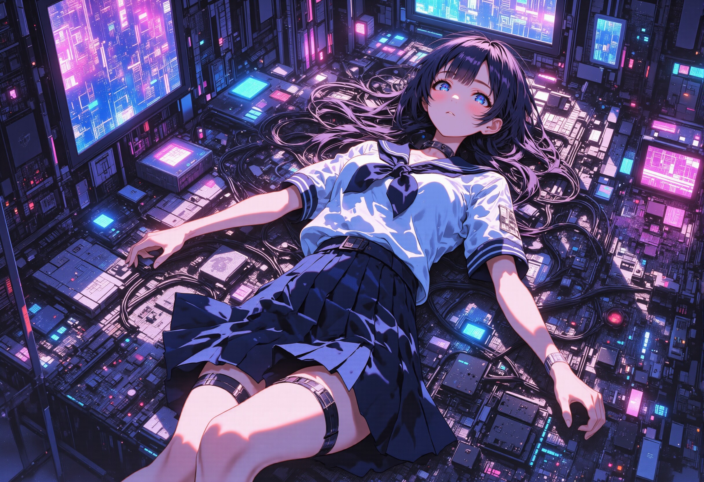 Steps: 50, Sampler: Euler, Schedule type: Simple, CFG scale: 1, Distilled CFG Scale: 3.5, Seed: 3157926139, Size: 832x1216, Model hash: 2abace2516, Model: lyhAnimeFlux_v4Niji, Denoising strength: 0.4, ADetailer model: face_yolov8n.pt, ADetailer confidence: 0.7, ADetailer dilate erode: 4, ADetailer mask blur: 4, ADetailer denoising strength: 0.4, ADetailer inpaint only masked: True, ADetailer inpaint padding: 32, ADetailer version: 24.11.1, Hires upscale: 2, Hires steps: 15, Hires upscaler: 4x-UltraSharp, Lora hashes: "s: 68e2f98b428f, Cyber_Room: 15b5aa1bfd33, ral-crystalz: 04954de5fcad, ck-holographic-glitter-000015: 90aa4411c77a", Version: f2.0.1v1.10.1-previous-528-ge55cde9b, Module 1: ae, Module 2: clip_l, Module 3: t5xxl_fp16