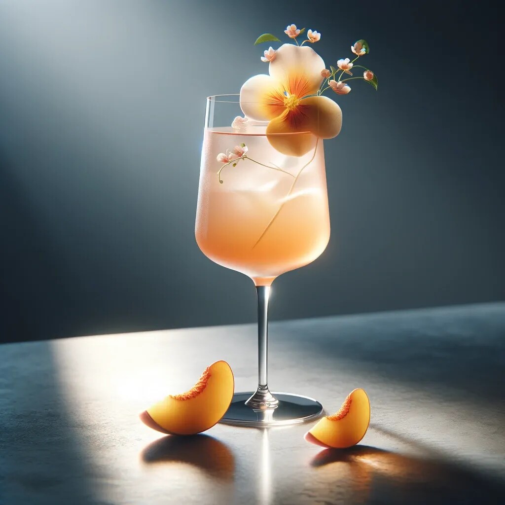 シンプルなロングドリンクグラスに注がれた、この美しい桃色のカクテルは、その美しい見た目と繊細な味わいで、特に暖かい季節の夜にぴったり。エディブルフラワーと薄切り桃の飾りで一層魅力的です。