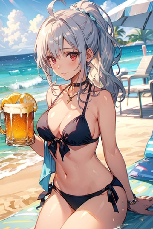 暑いの海辺でマリーが生ビールレモン添えでかんぱーい!