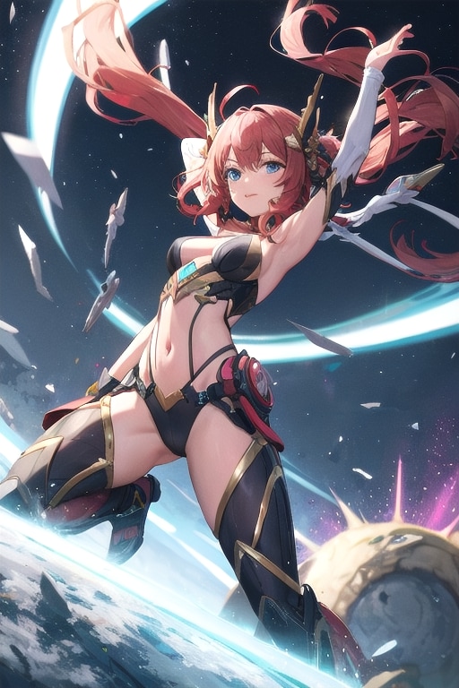 fluttering, arms, armpit, twin tails, art, planet, phantom, red, elegant, ear, navel, temptation thighs, fantasy, on, open outfit, cyber, ecstasy pose,