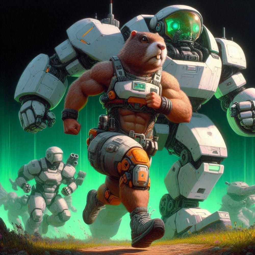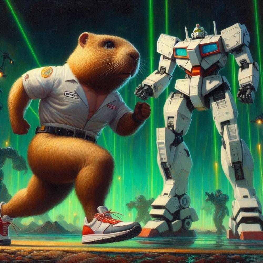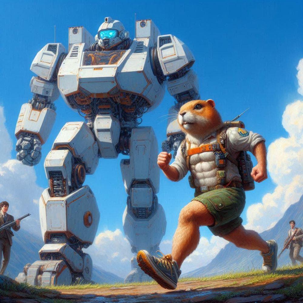 アニメ油絵風、スニーカーで走るロボパイロットマーモット