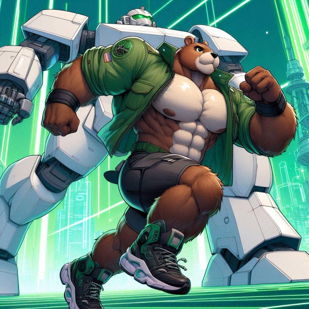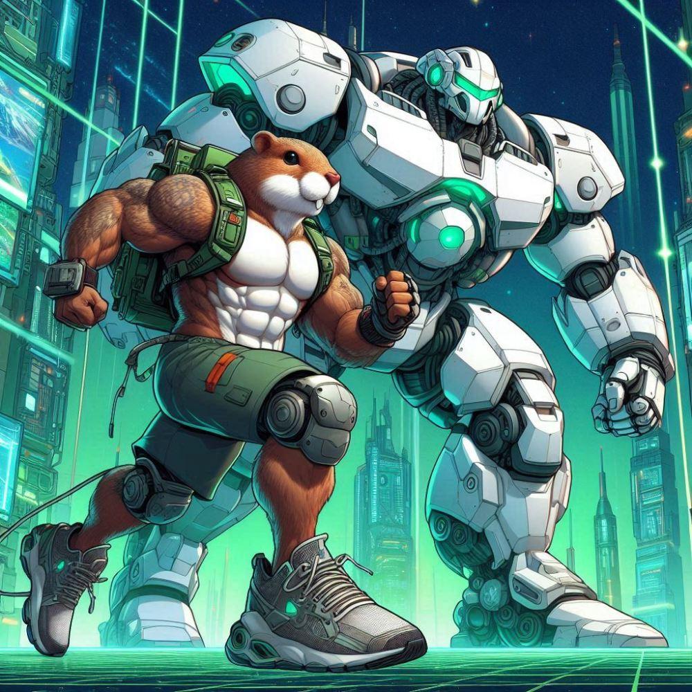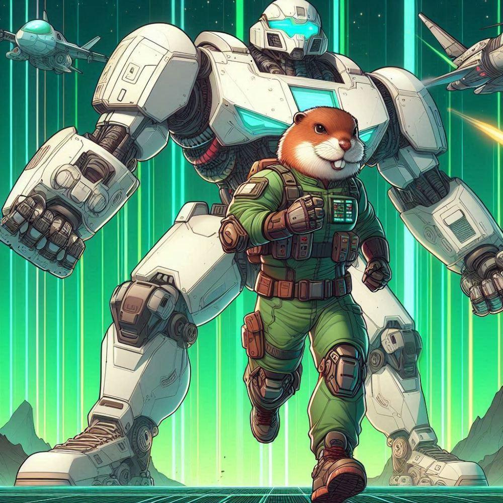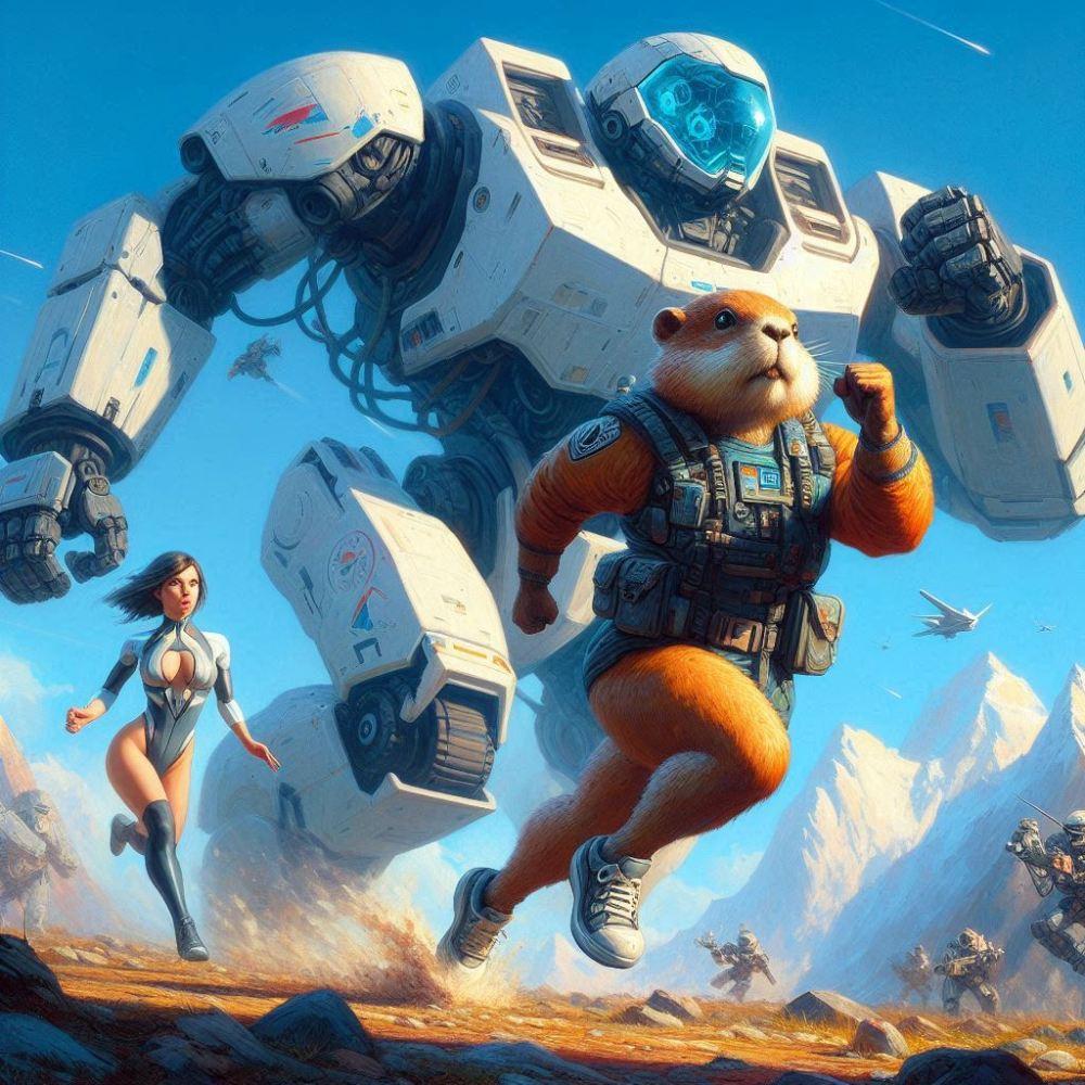 アニメ油絵風、スニーカーで走るロボパイロットマーモット