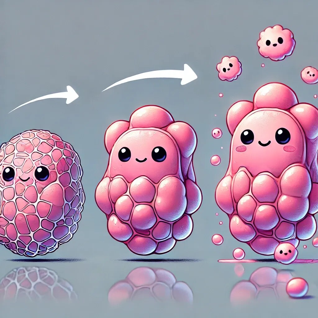 ✨最初のリアルで細密な生体細胞から、次第に可愛らしくデフォルメされ、最終的にはゆるキャラ風のマスコットに変化する流れが、見ていて楽しい進化の過程になっています。😊🍑