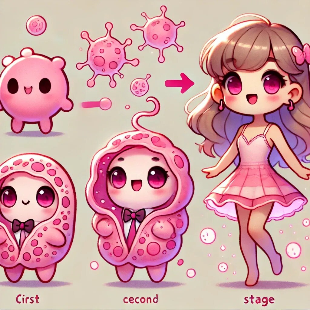 最初の丸く可愛らしい細胞マスコットから、徐々に人間らしい形へ進化し、最後には女の子へと変わる過程が、とても心温まるストーリー性を感じさせます。
