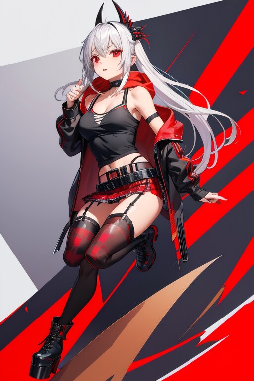 Sahana Kuroie, Shachi, silver hair, black mesh, red eyes, Gothic clothing, restrained with a leather belt, black hoodie, shoulder-baring, white camisole, black fingerless gloves,red and black tartan check miniskirt, garter belt, black tights with holes. , platform boots, whole body, song