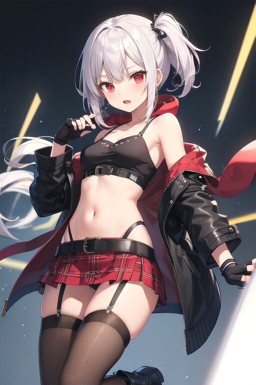 黒家沙花、シャチ、銀髪、黒メッシュ、赤目、ゴシック服、革ベルト拘束、黒パーカー、肩出し、黒いコート、白キャミソール、黒い指なし手袋、赤黒タータンチェックミニスカート、ガーターベルト、穴あき黒タイツ。 、厚底ブーツ、全身、歌