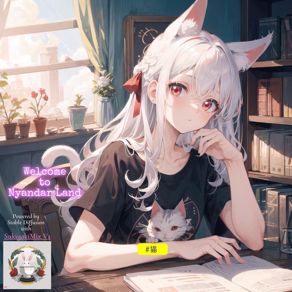 今度はお淑やかな白兎のエリアーヌ(https://www.chichi-pui.com/posts/a340910d-90a1-4f93-b485-67bf1e6abadf/ など)の変化です。いつもはrabbit earsの呪文でうさ耳が出ています。積み重ねられたSeed値の力かうさぎパワーか、なかなか変わらなかったのですが、服装の呪文を(cat logo tee:1.3)まで強めるとそこで服装以外まで影響が及んで猫耳に変わりました。