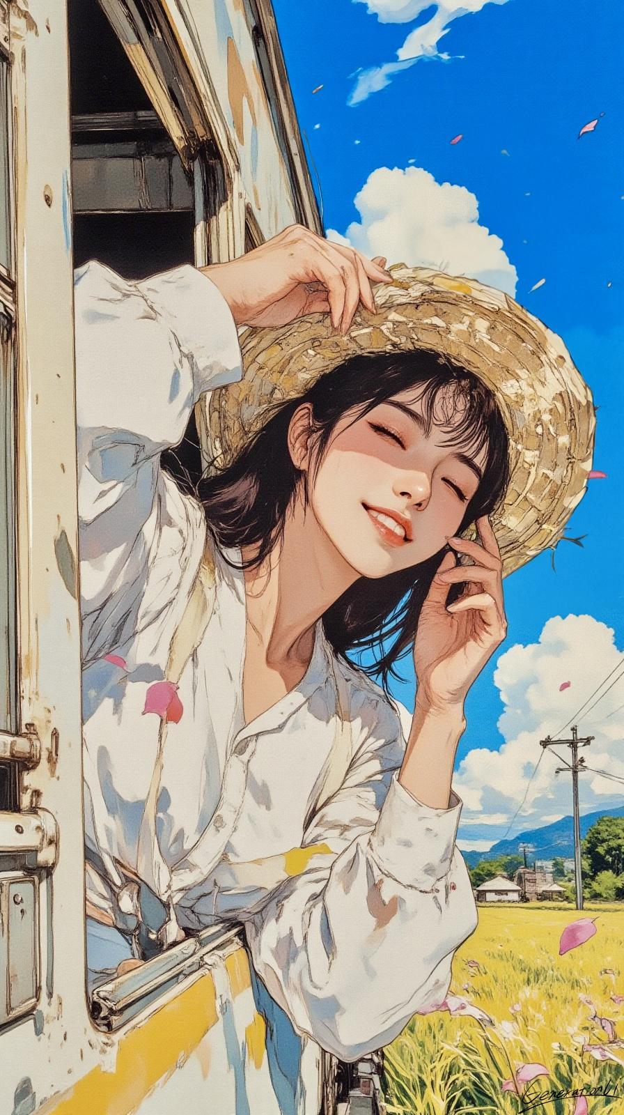 麦わら帽子が風に揺れ、頬に当たる陽光が柔らかく笑顔を包んでいる。