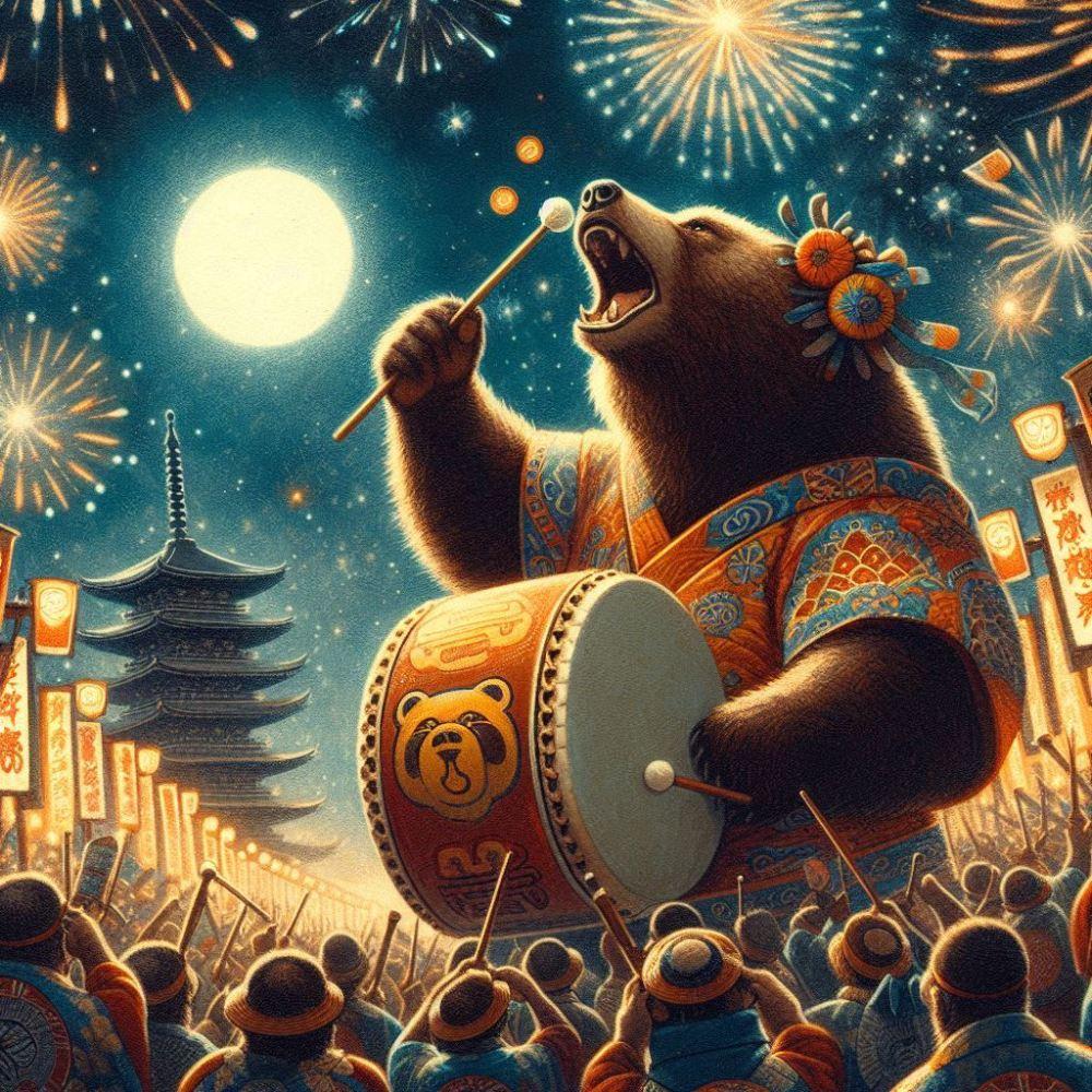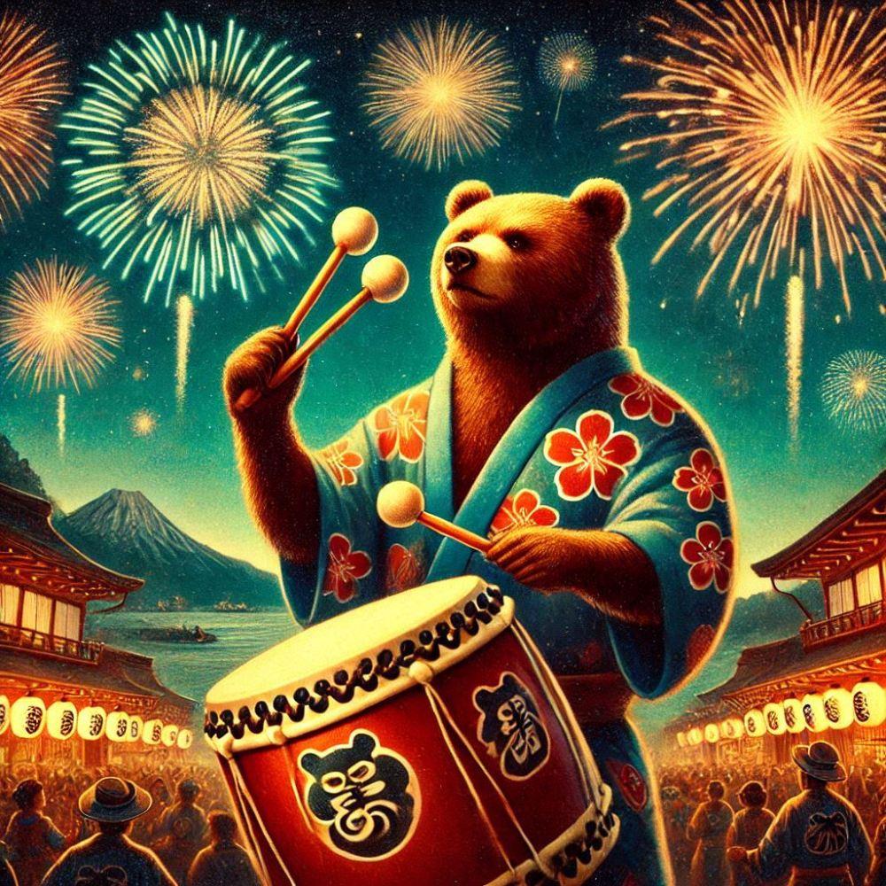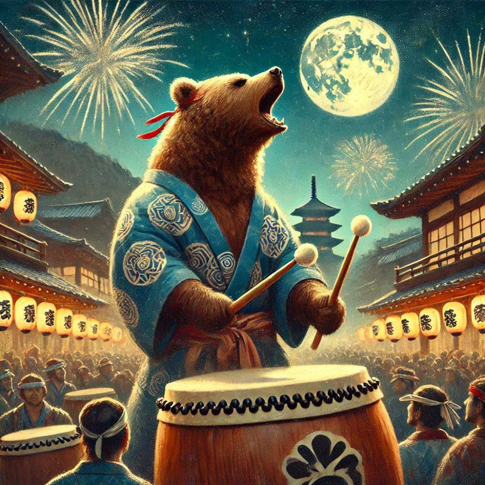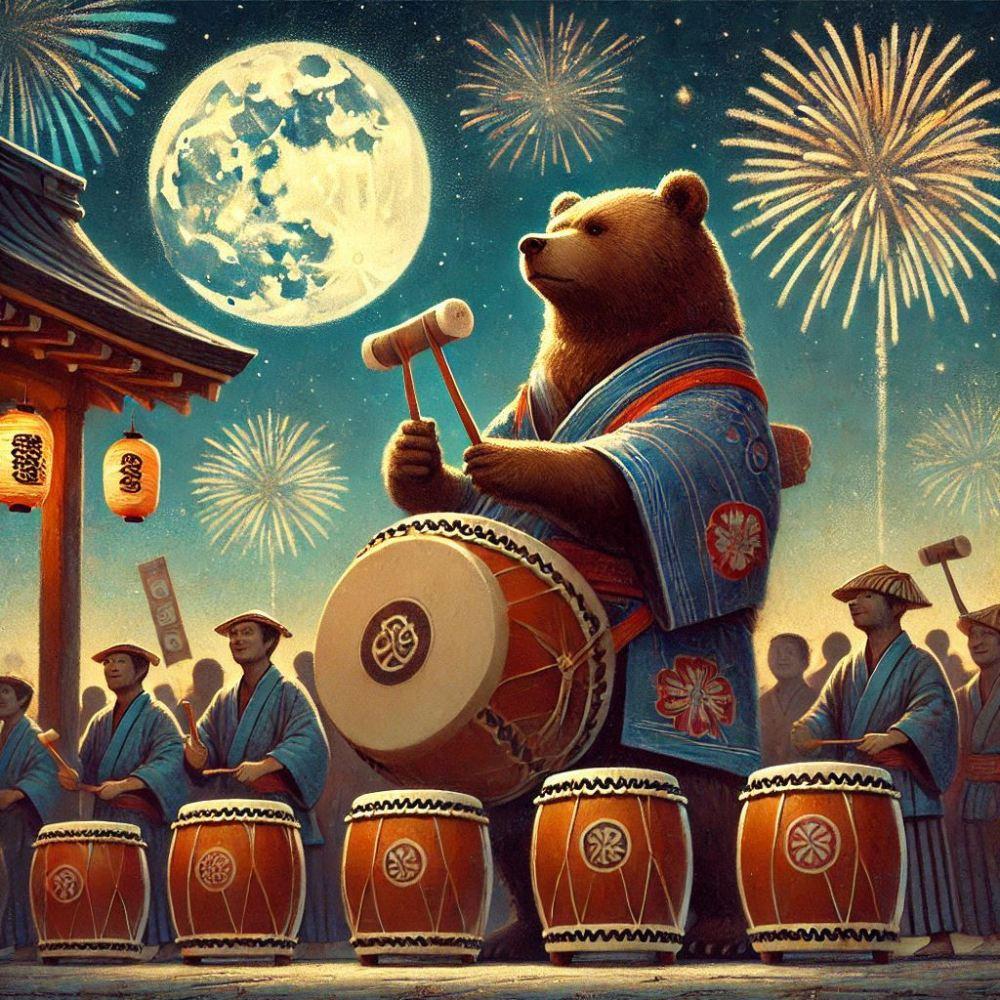 油絵、夏祭りで和太鼓を叩くヒグマ