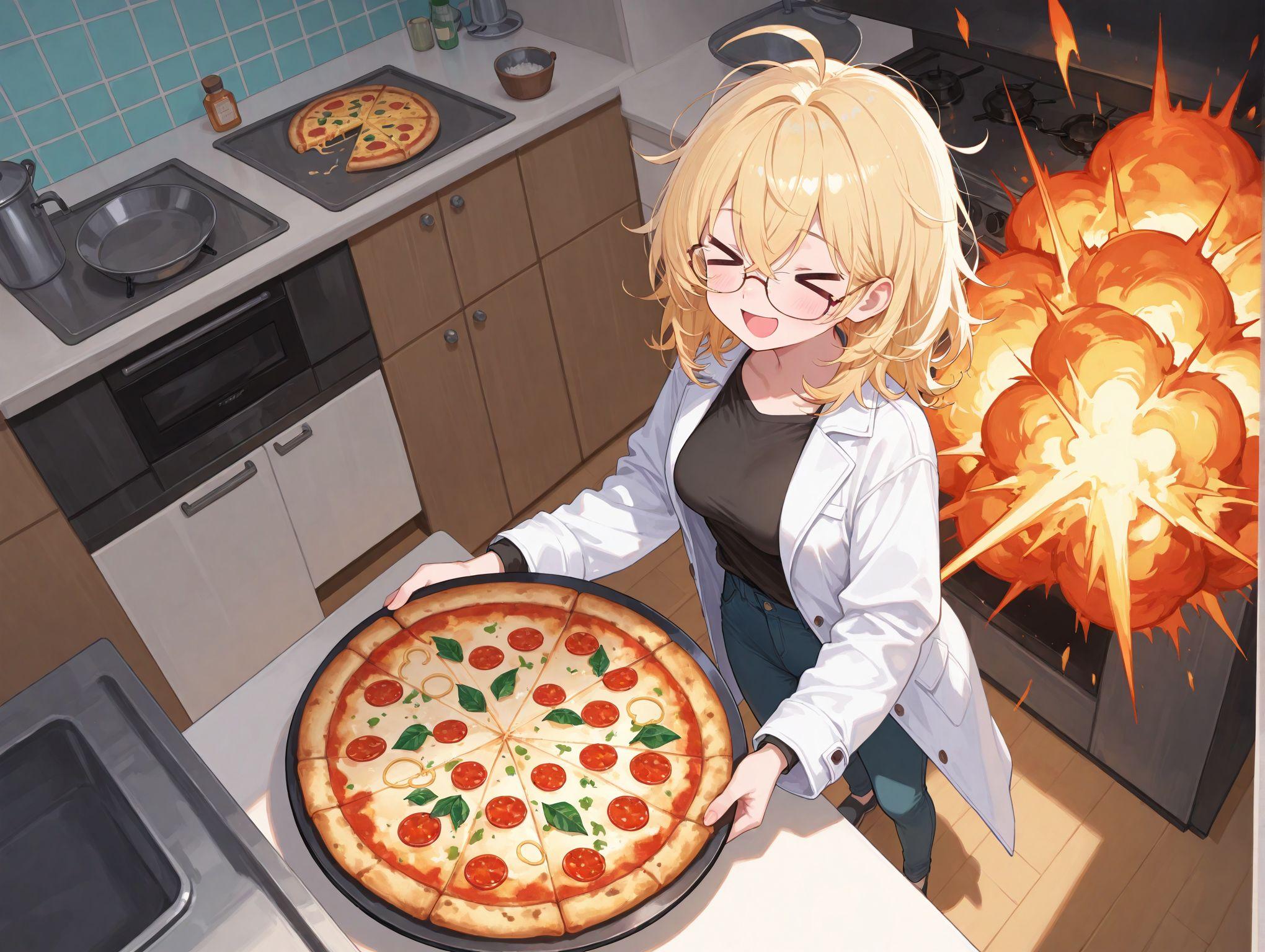ピザが円盤状のまま宙を舞い、天井に完璧な円形のシミを残して爆散した。