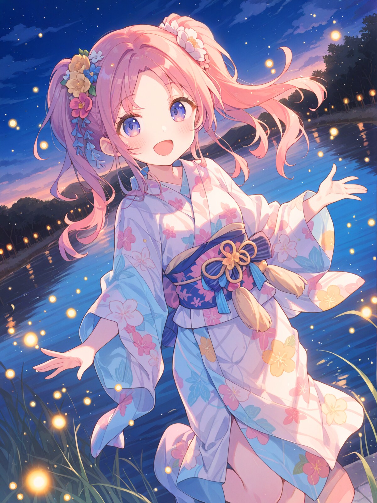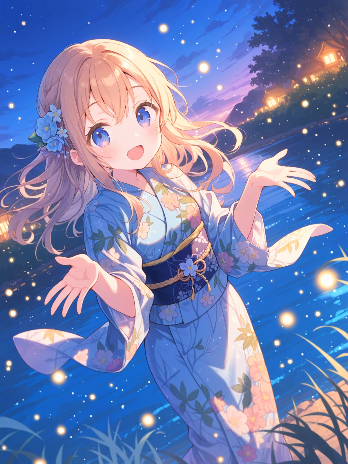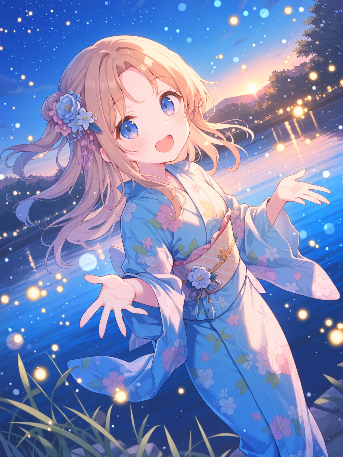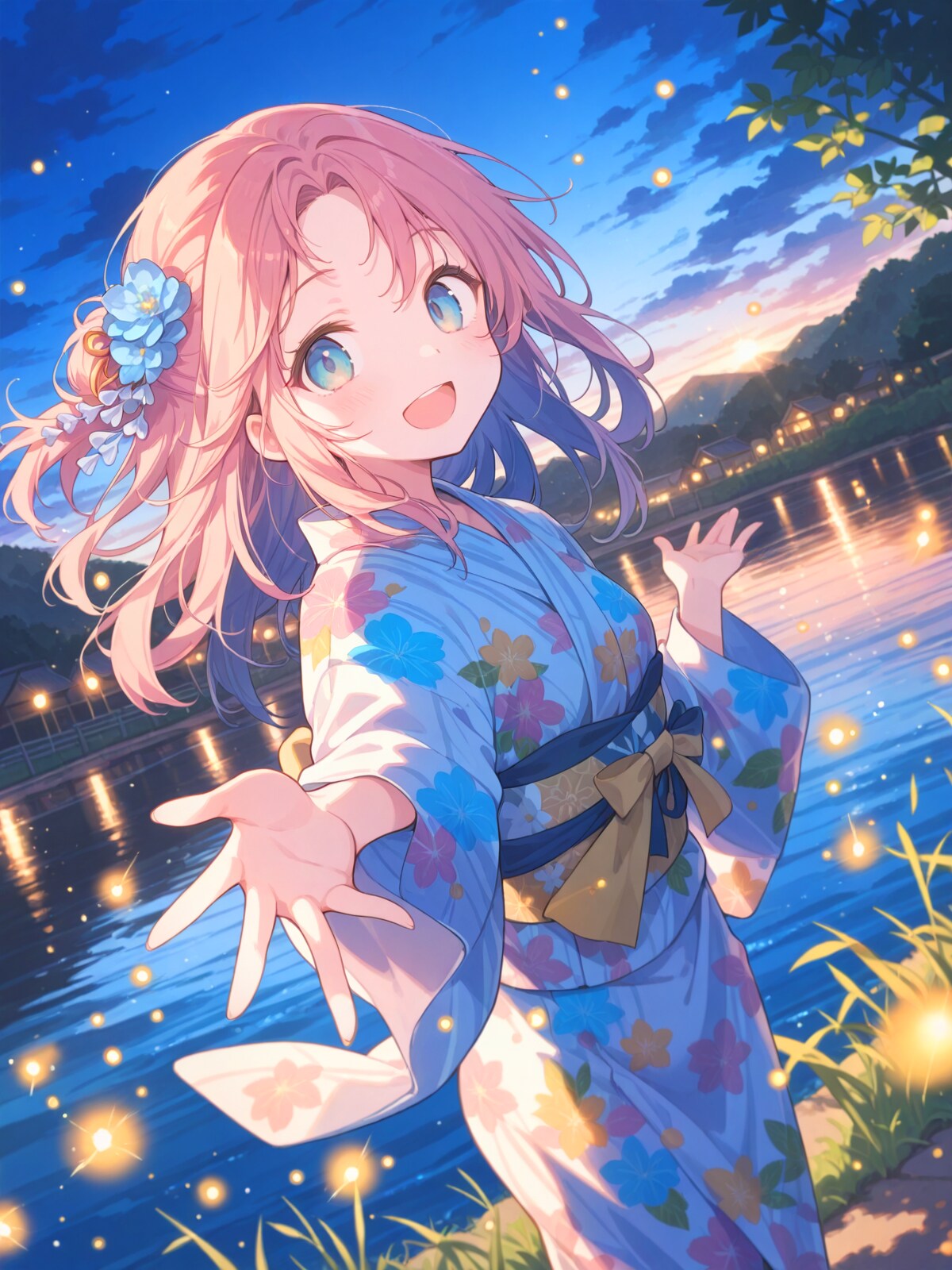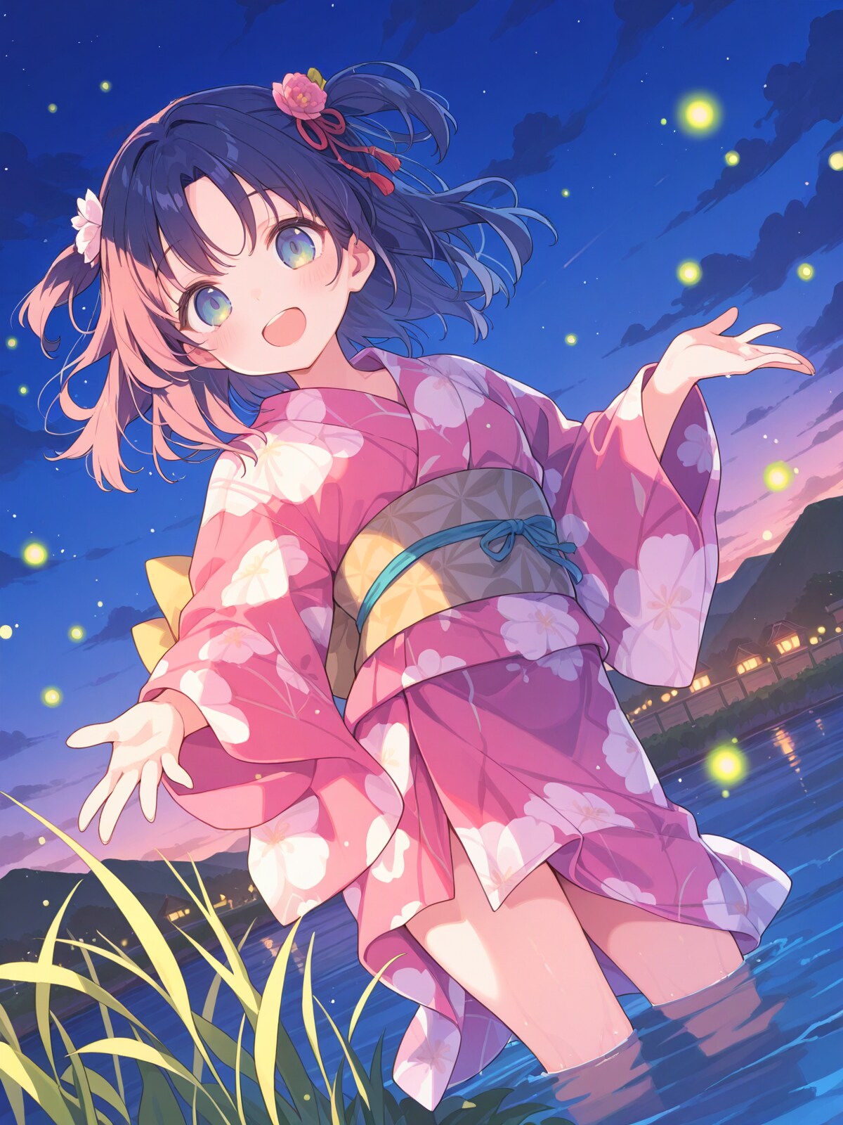 夏の夜に河原にホタルを見に来た浴衣姿の女の子を作ってみました。