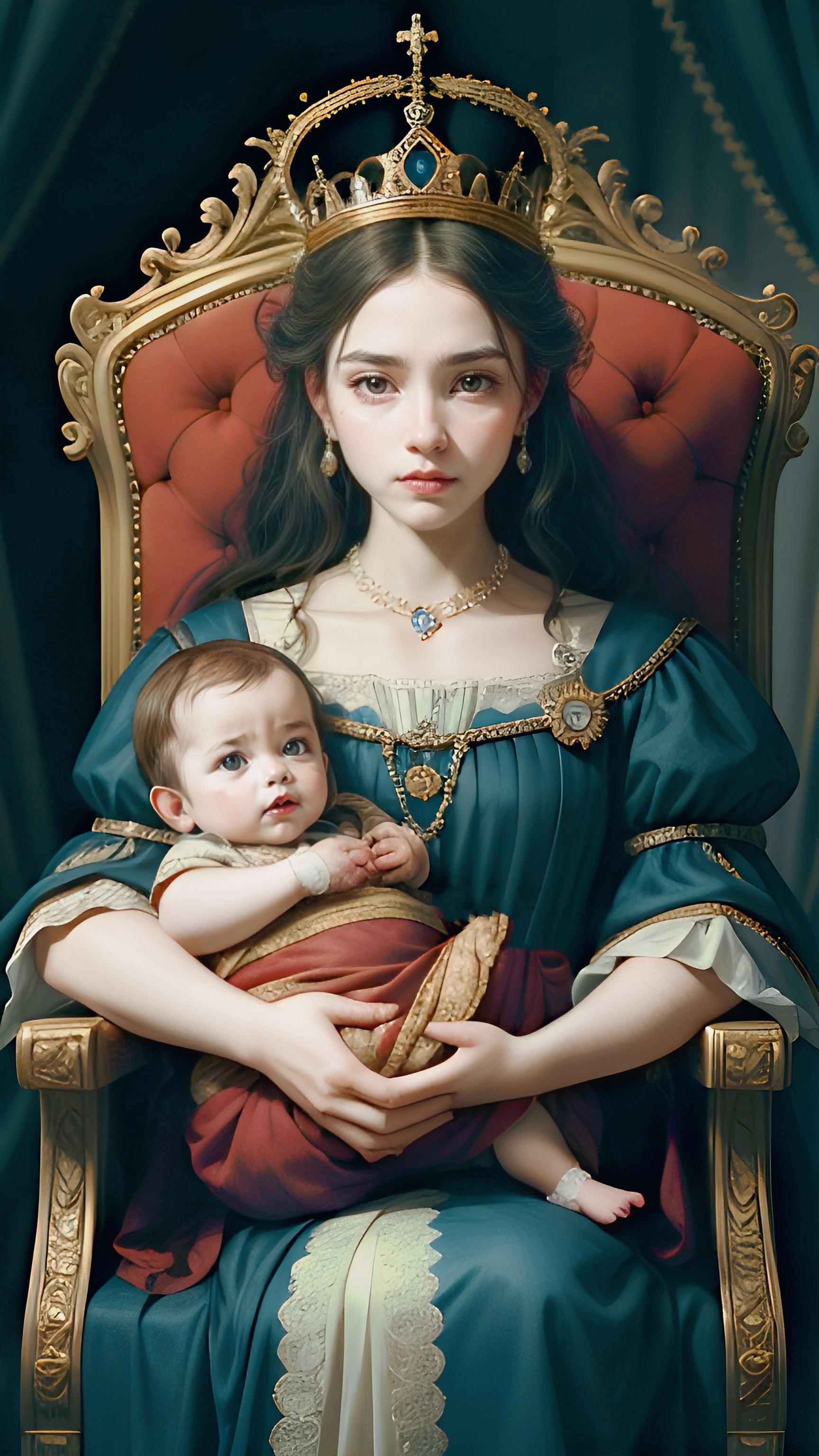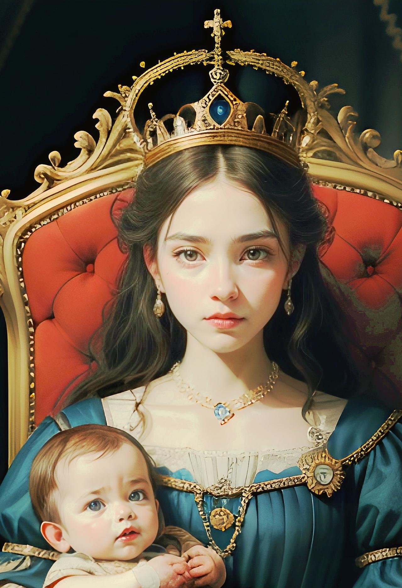 肖像画の描写の折に、その玉冠が度々落下する事につき 守り役たる女性が玉冠が落下した時に咄嗟に、玉冠を被りし時に描写 したと推察される 】