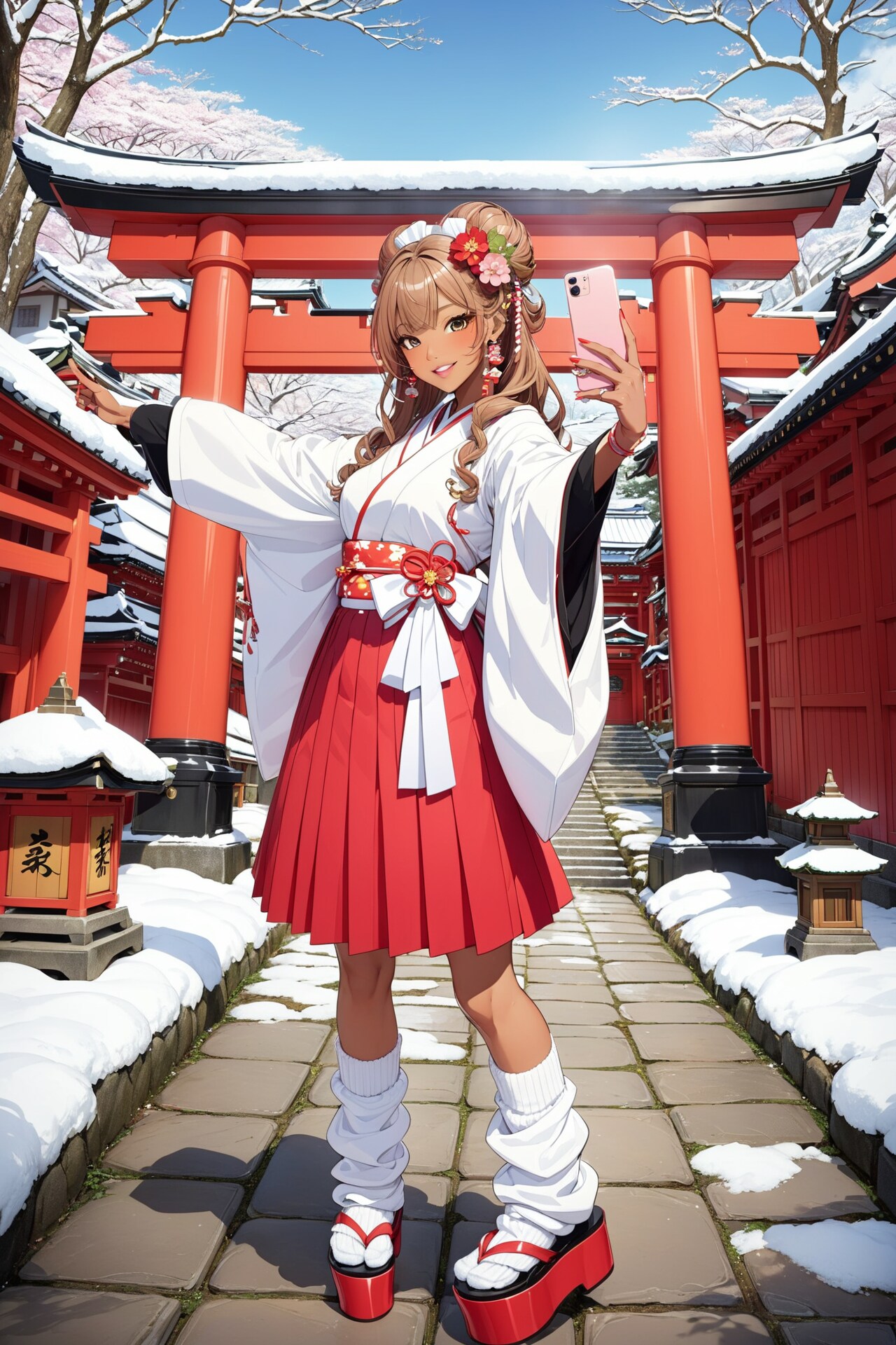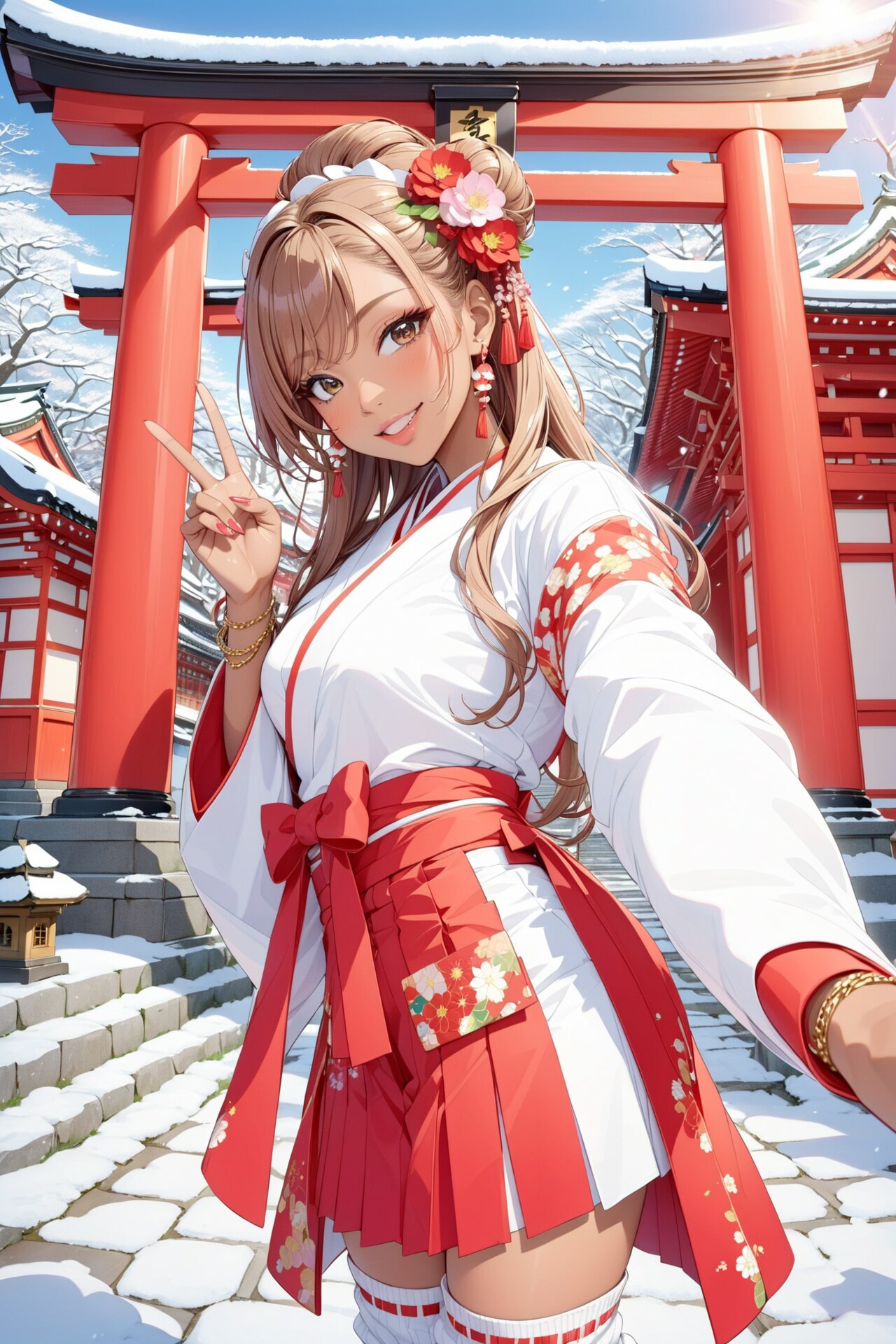 参拝客をほったらかしにして自撮りにいそしむ巫女×ギャルさんです。