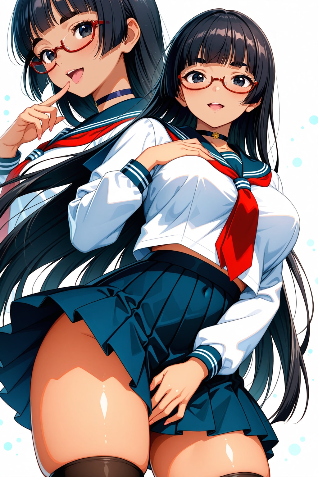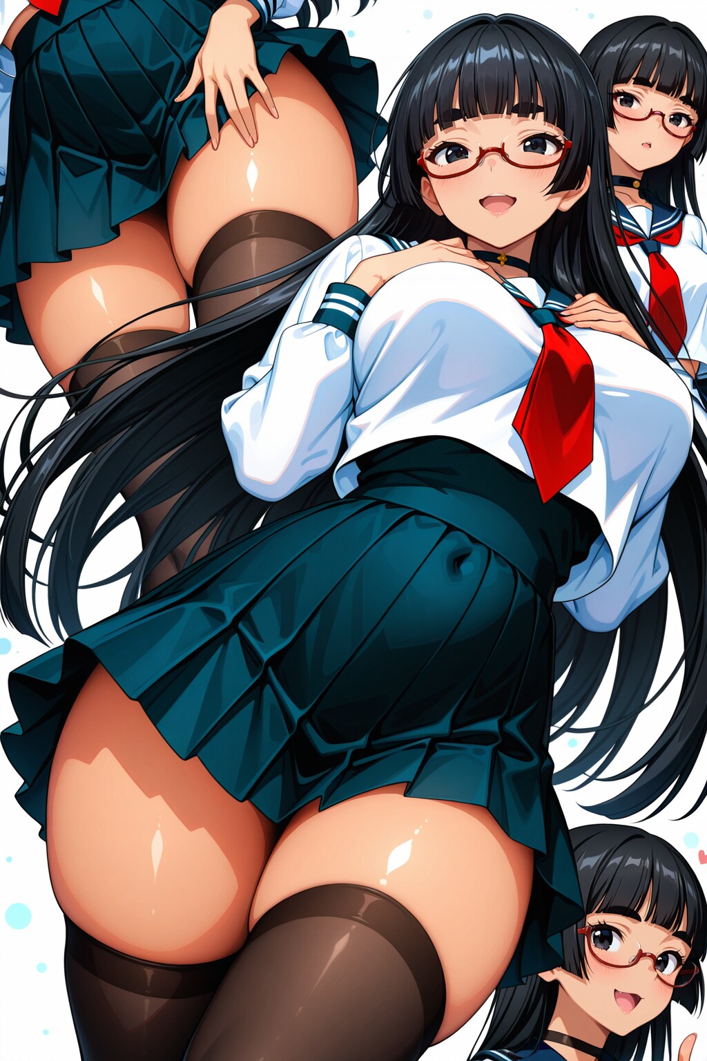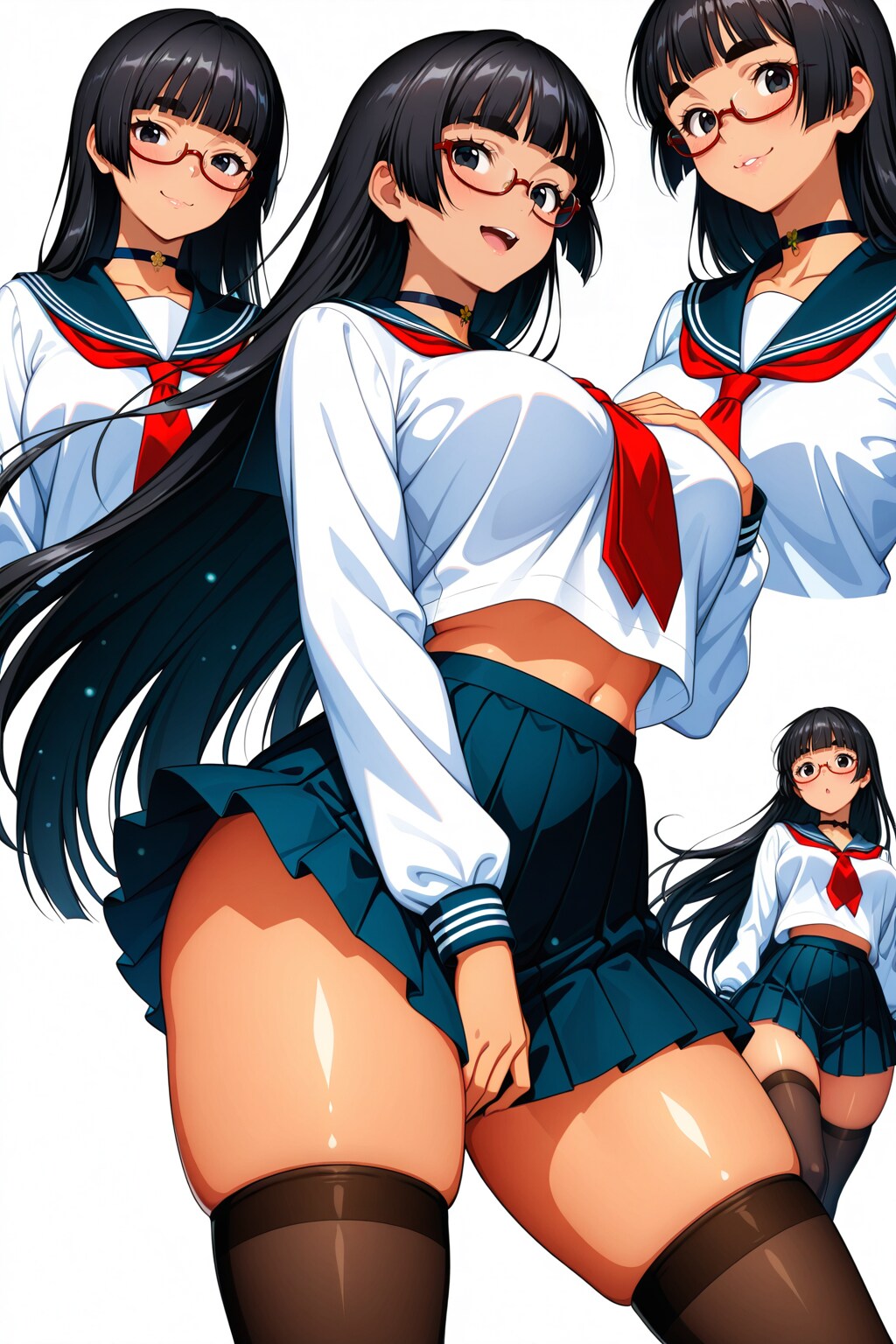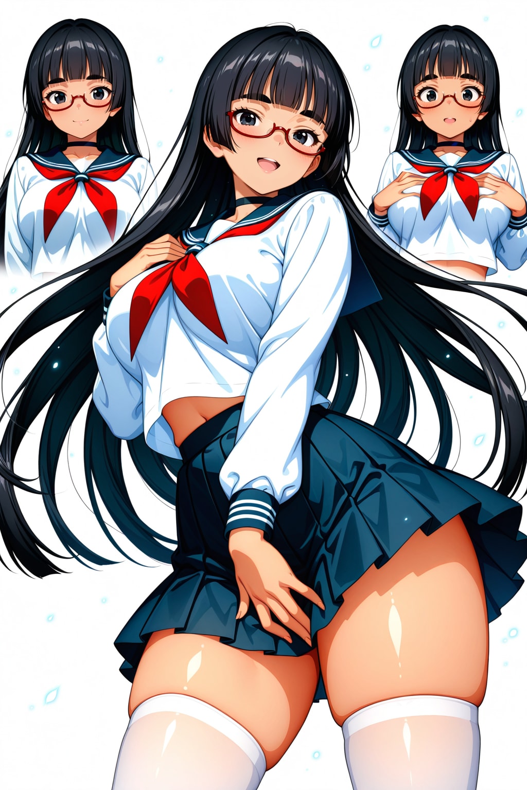 ((black eyes), long hair:1.3), (hime cut), (round eyes wide:1.3), (thick eyebrows), (large breasts), (tan:1.3), (serafuku), (curvy),