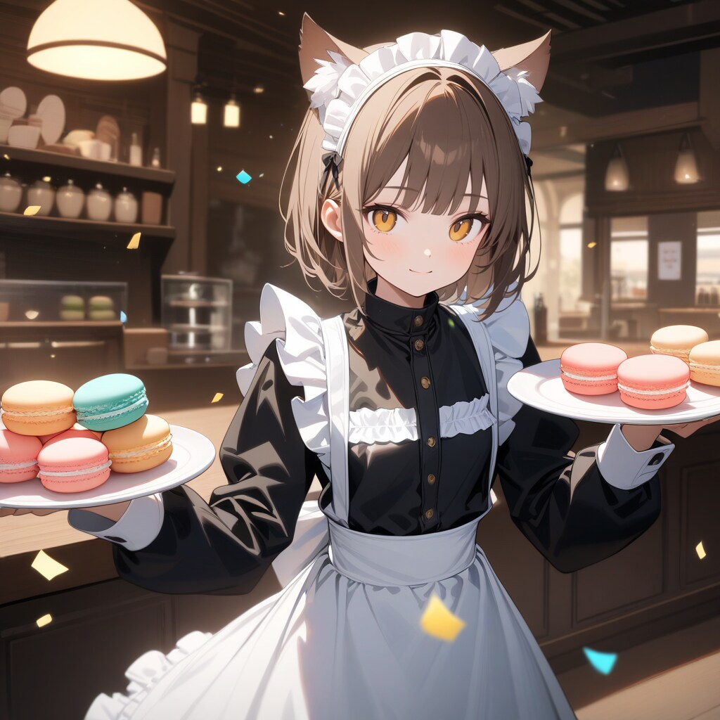 マカロンを運ぶ喫茶店で働く猫娘