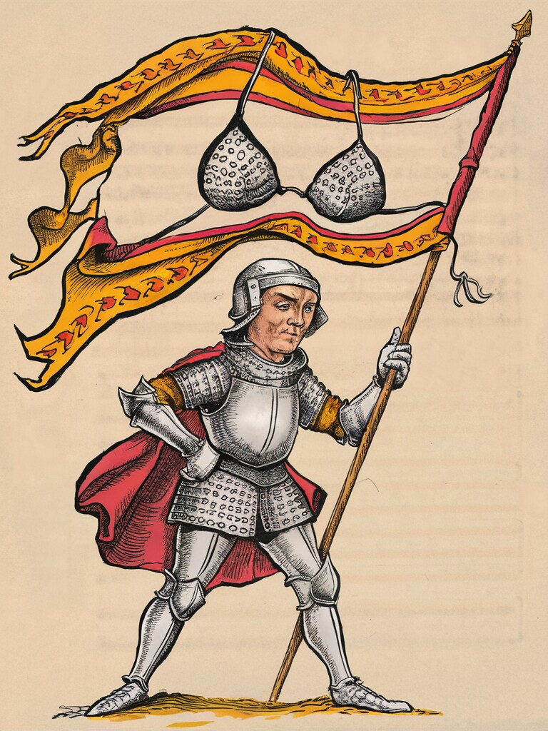 では、なぜ騎士たちはビキニのデザインの旗を掲げているのでしょうか?この写本が制作された時代、ビキニのようなデザインの水着が上流階級の間で流行していたのです。騎士たちがこの旗を掲げることは、当時の最先端のファッションセンスを示唆しているのです。