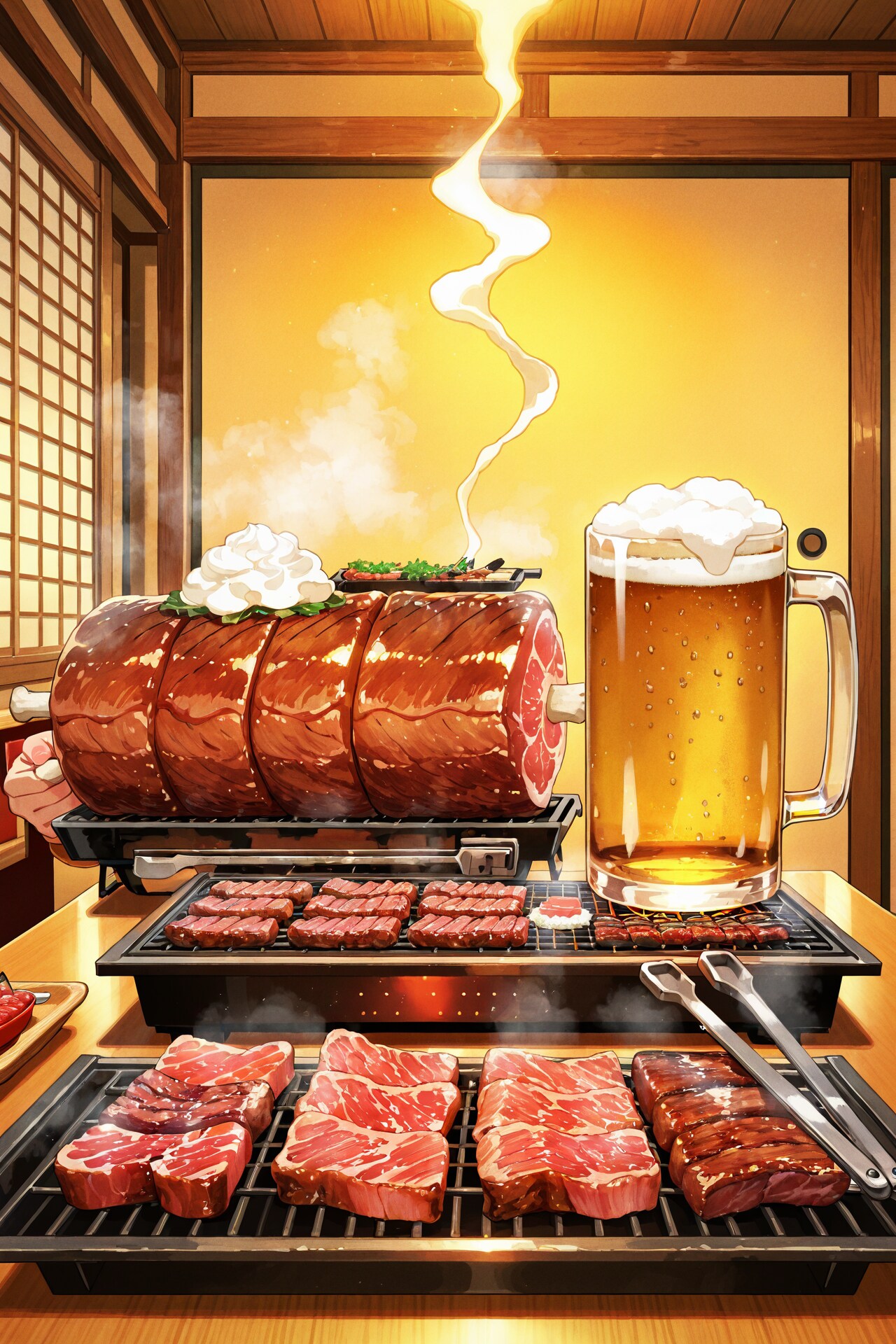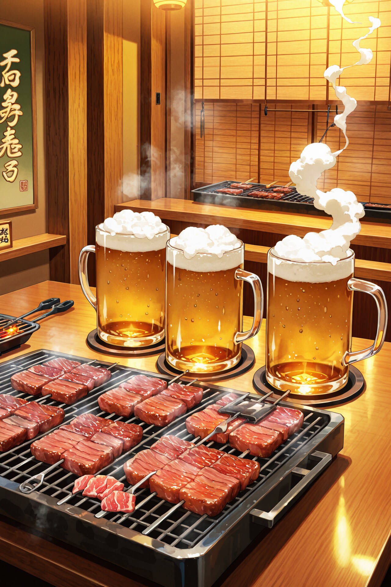 誰もいなかったり、ビールの泡がそのまま煙りに変化していたり、まんが肉が出てきたり、さらには巨大なビールジョッキを焼いていたり・・・