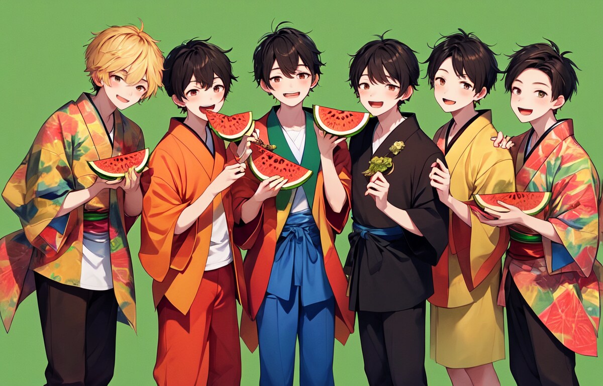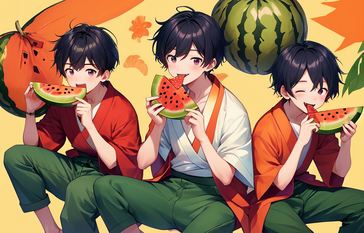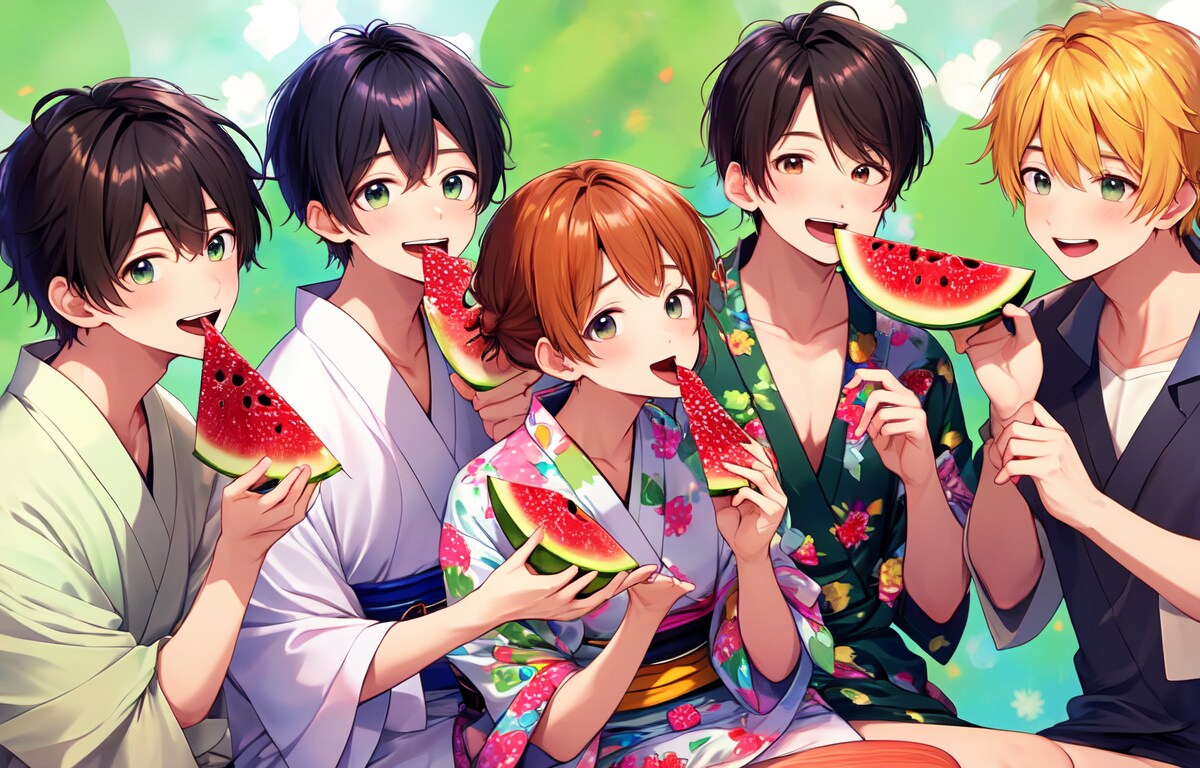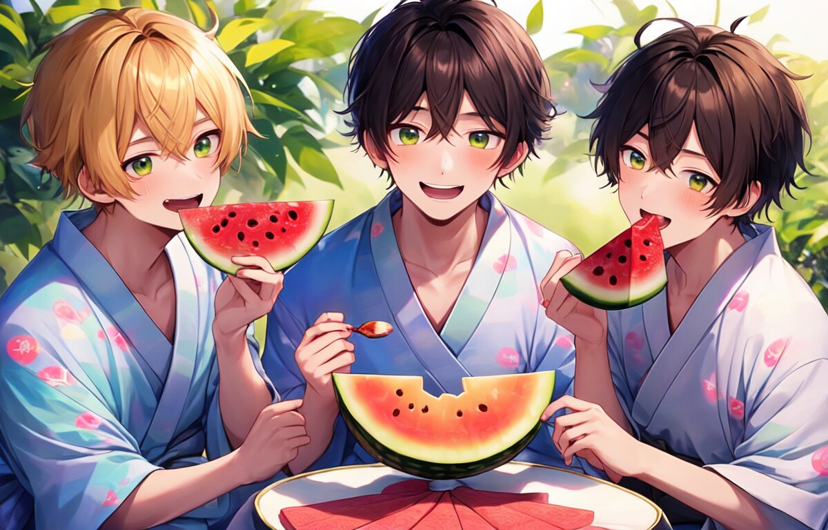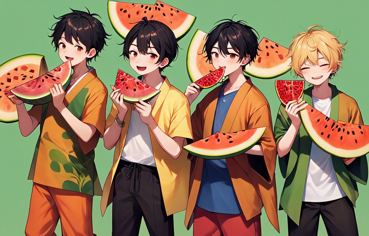 高校生ぐらいの男子達がスイカを食べている集合図を作りたい!!と思い、生成。いつもより上手くいく確率は高かったですが、食べる描写がやっぱり難しいですね。