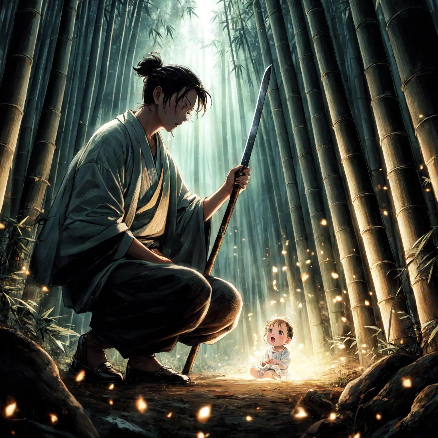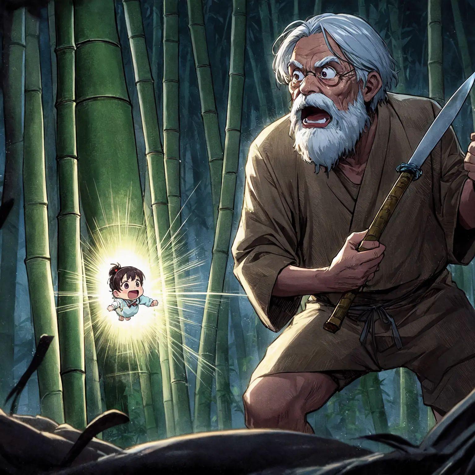 ある日、おじいさんが竹やぶに行くと、根元が光っている竹を見つけました。