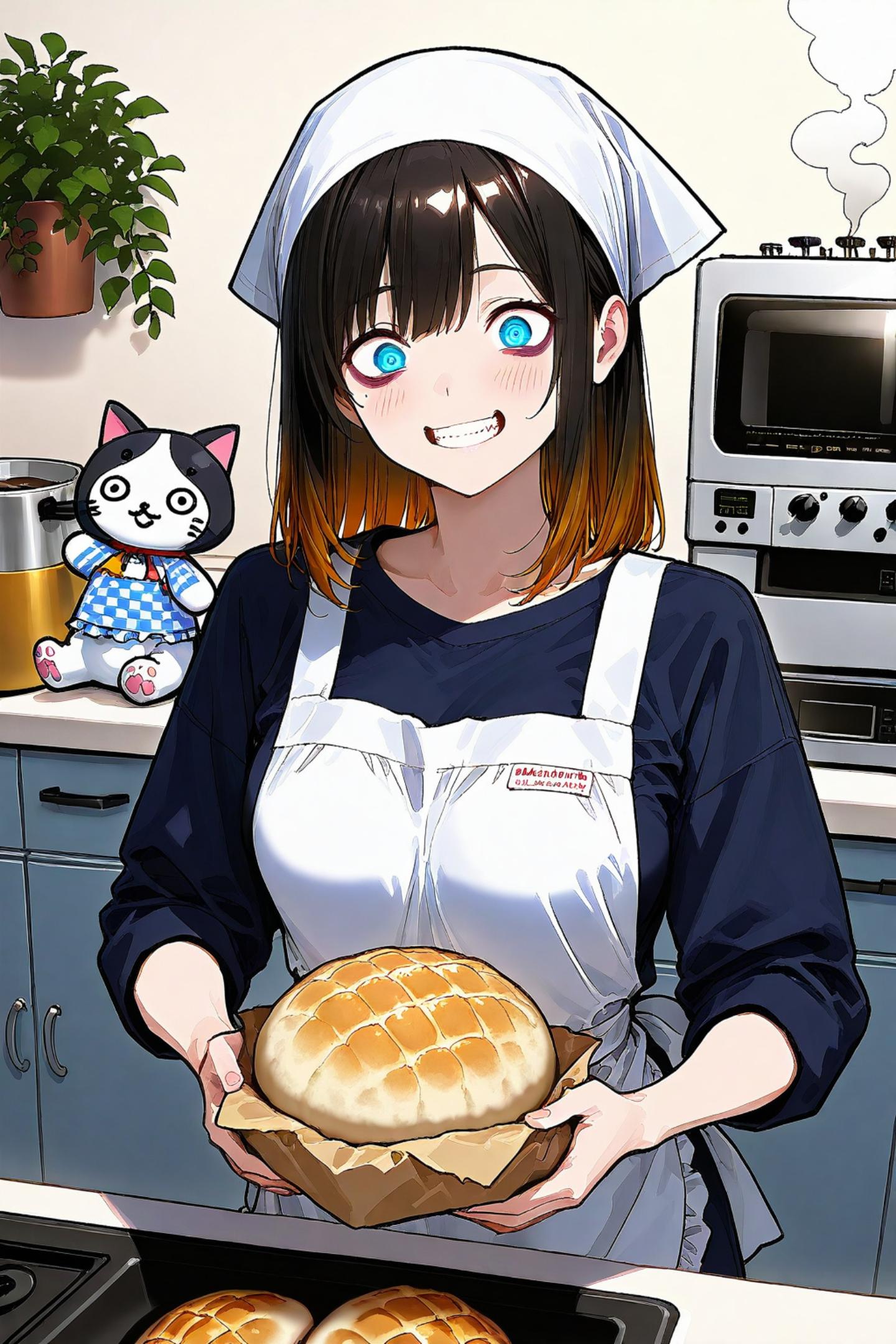 kitchen,gray wallpaper,cooking machine,stuffed cat,bread,smoke,