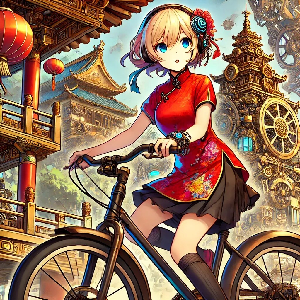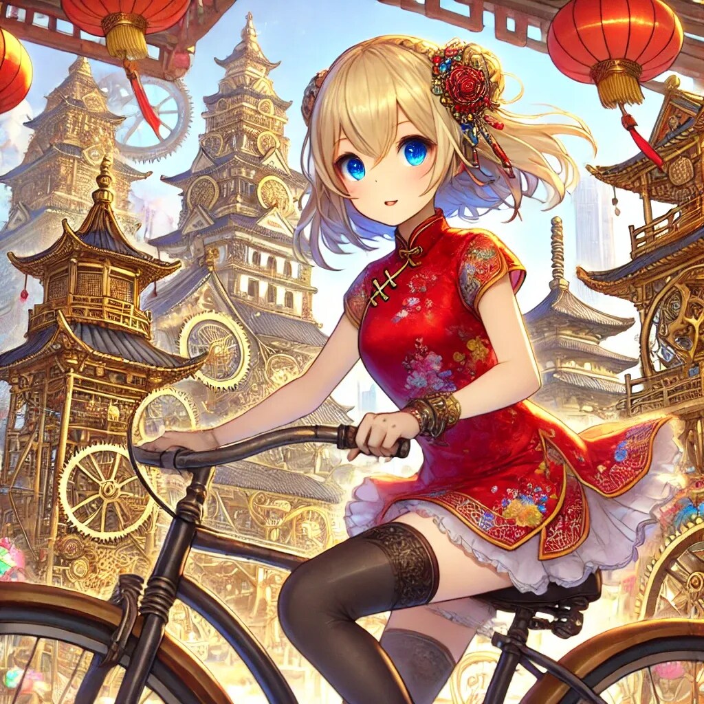 機械仕掛けの寺院と赤いチャイナドレスの組み合わせが、アジアンテイストのスチームパンクという独特の世界観を見事に演出しています。