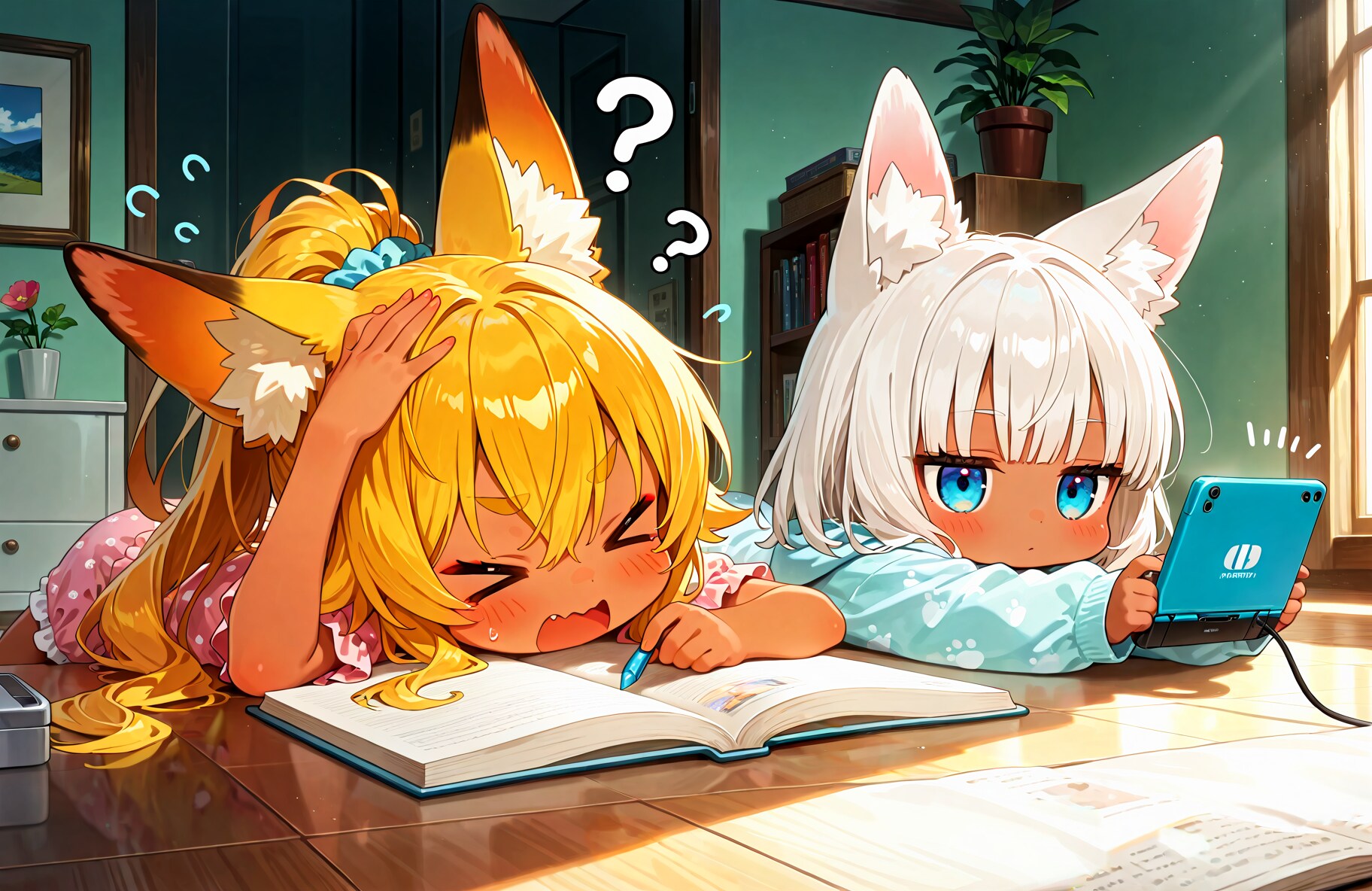 宿題で焦る金狐と余裕な白狐ちゃん