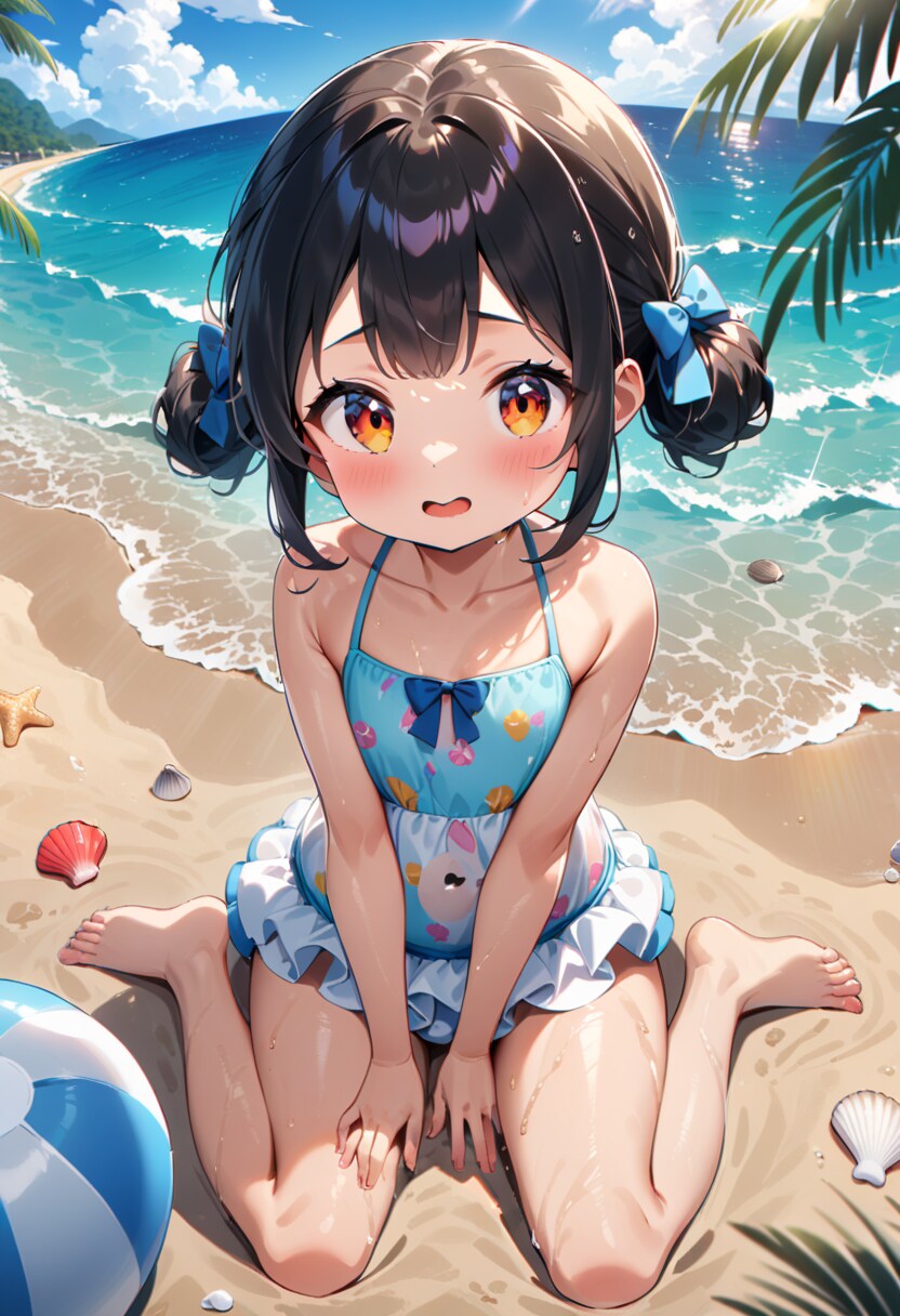 ユイは、夏の輝かしい日をビーチで過ごしています。彼女のユニークな髪型、短い前髪と長いツインテールが、青い海に映えるカラフルな水着と共に揺れています。ユイは浜辺に浮かぶビーチボールを見つけ、喜んで水に飛び込みます。濡れてしまった彼女は、楽しげな笑顔を浮かべながら片手で日差しを遮ります。優しい波が彼女の周りで砕け散り、ユイの笑い声が響きます。砂浜には貝殻が散らばり、ヤシの木が暖かな風に揺れています