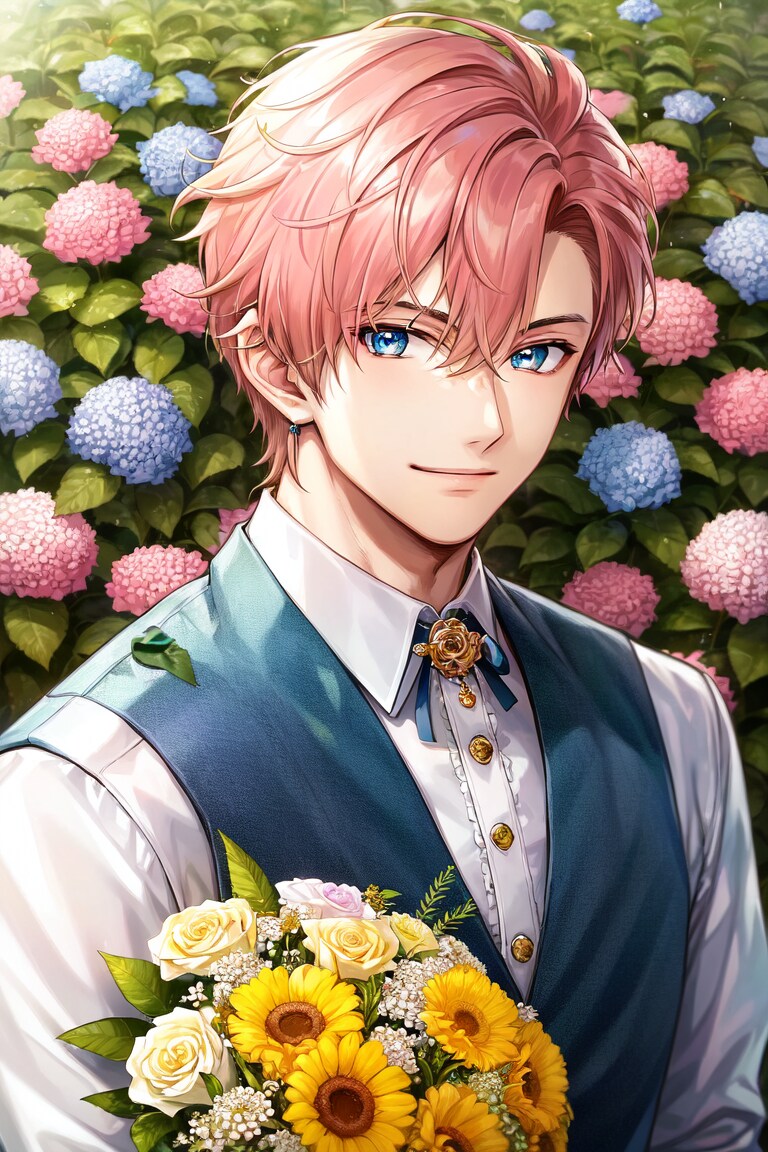 昨日偶然入れたプロンプト(花+男性の組み合わせ)がつぼったので、髪色や花の種類変えてみたりで出力したものをまとめました。