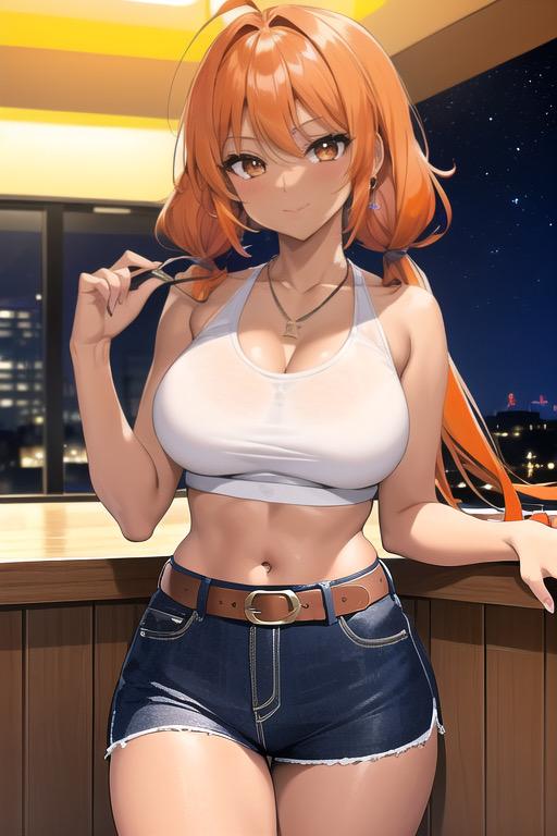 オレンジ髪にショートパンツ&ジーンズそしてタンクトップ姿のお姉さん達です。