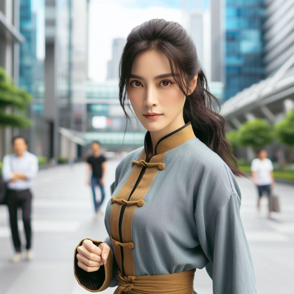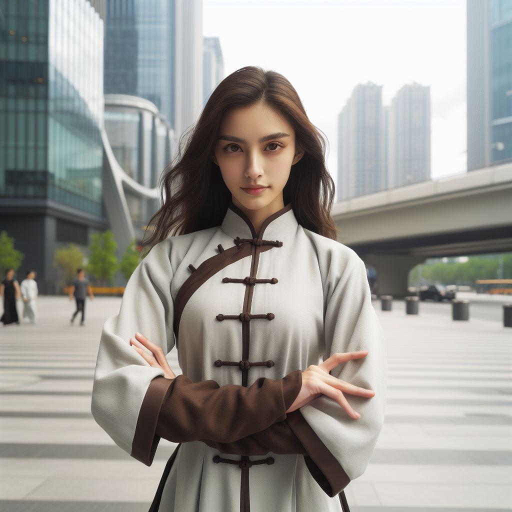 他の漢服要素やチャイナドレス要素を入れたければ、Tangzhuang style Kung Fu wear, Cheongsam style Kung Fu wearでいけそうです。ちょっとアクション要素も追加しました(3枚目〜)。