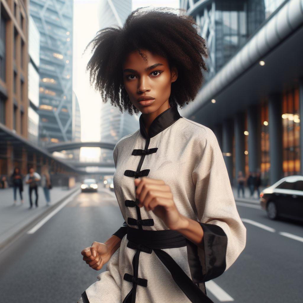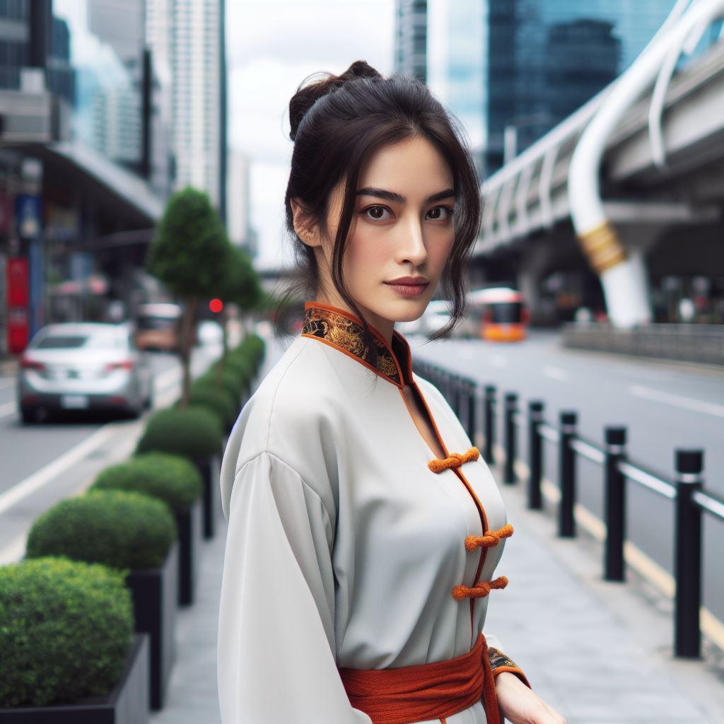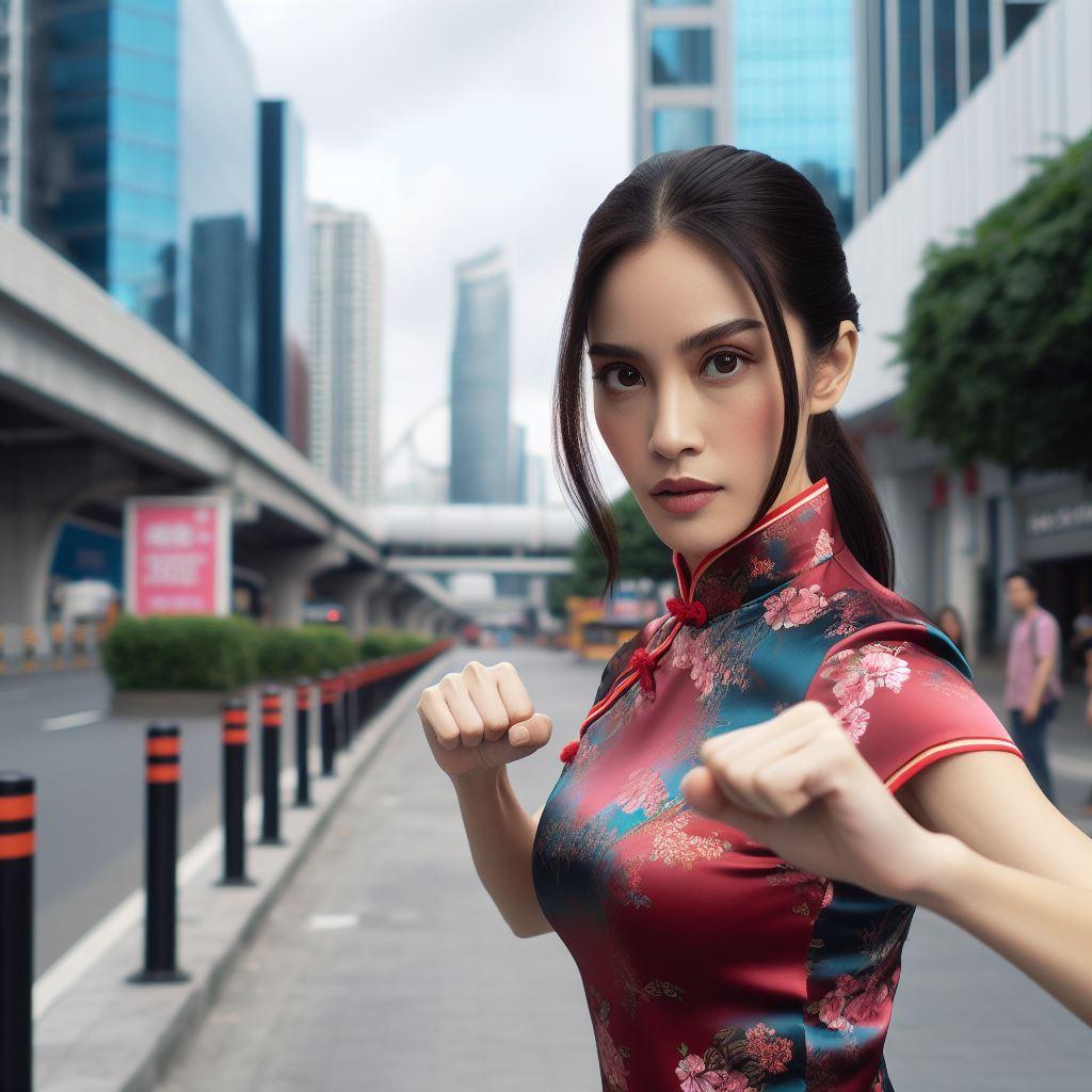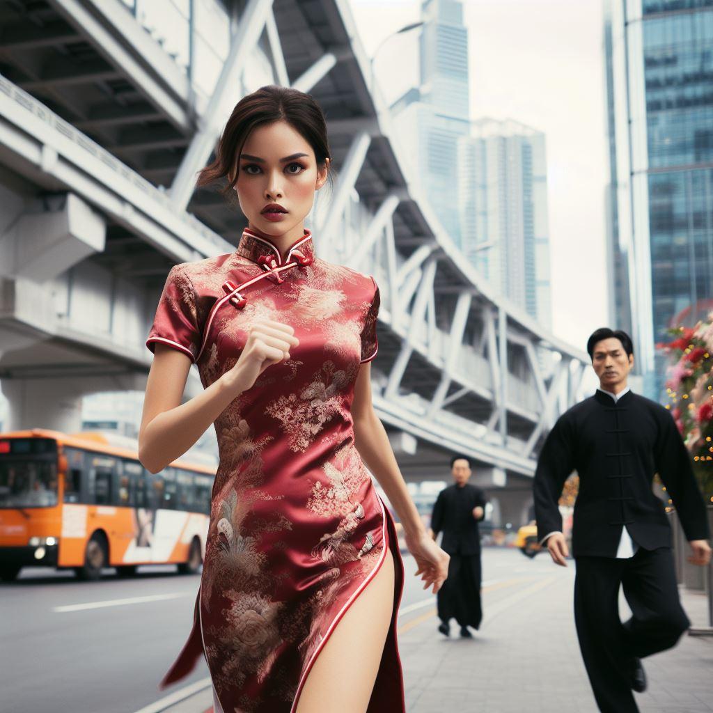 An actress wearing a Cheongsam style Kung Fu wear is walking down a modern urban street in an action scene. Looking at the viewer.