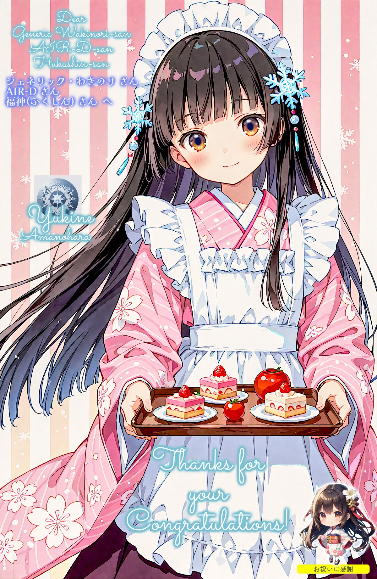 という理屈で、 拙作の作品世界のキャラたちで公式おすすめに載った回数TOP1の、和風少女の雪音さんの和メイドVerで御礼絵とする次第です。