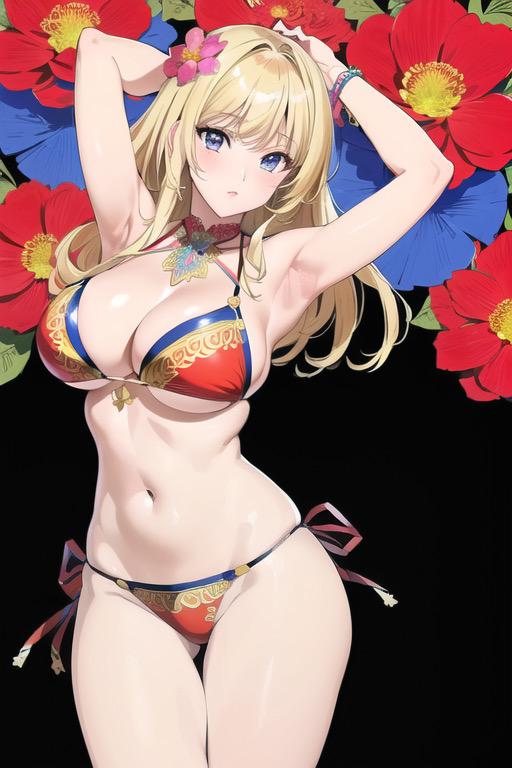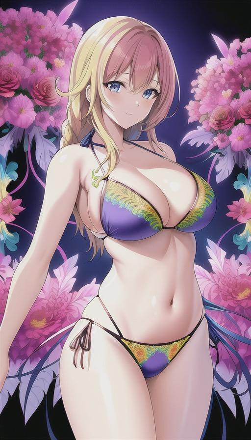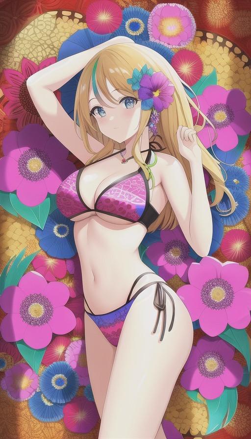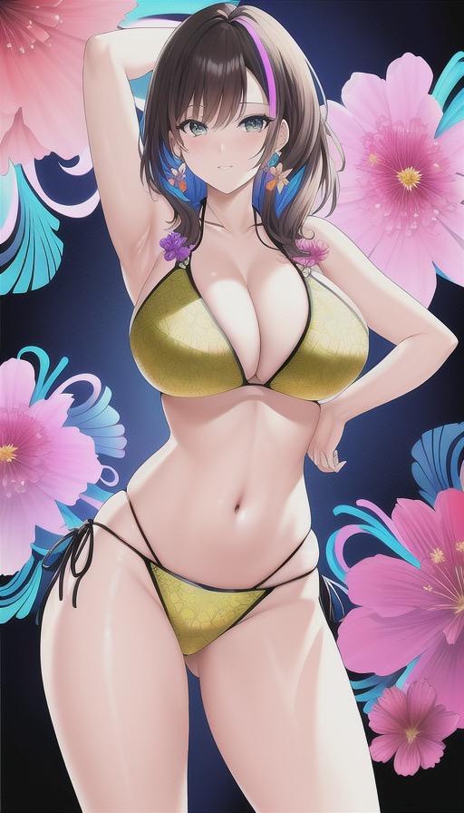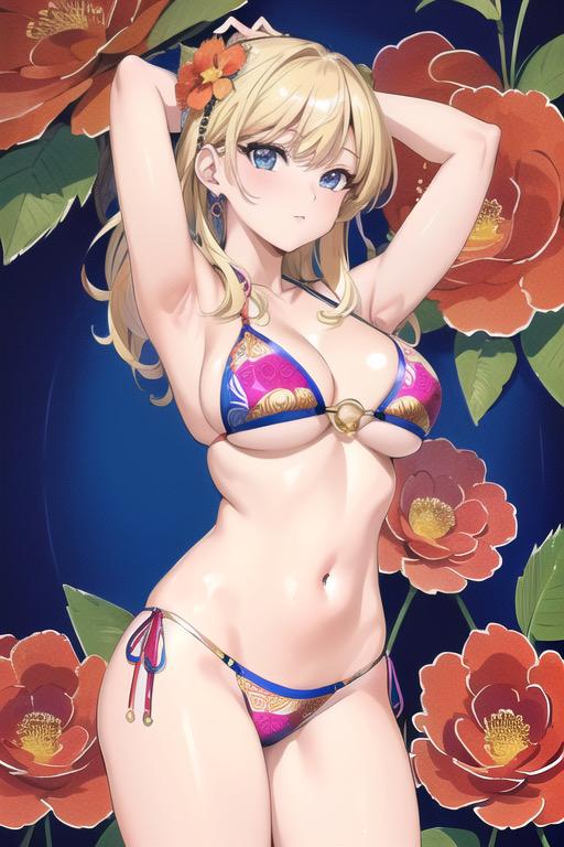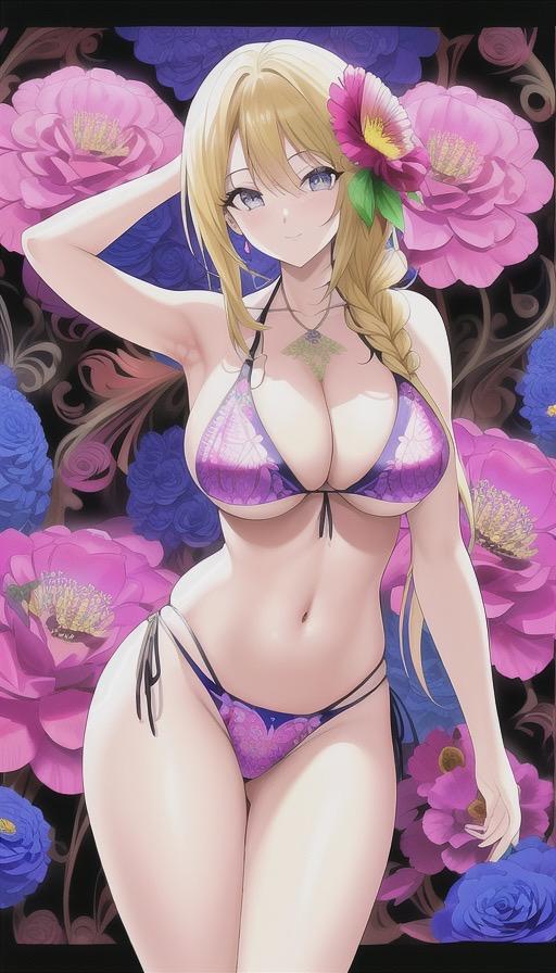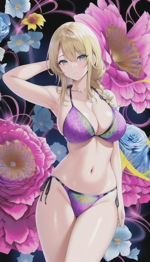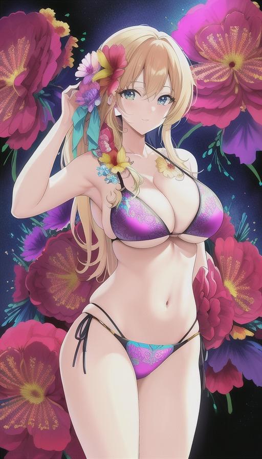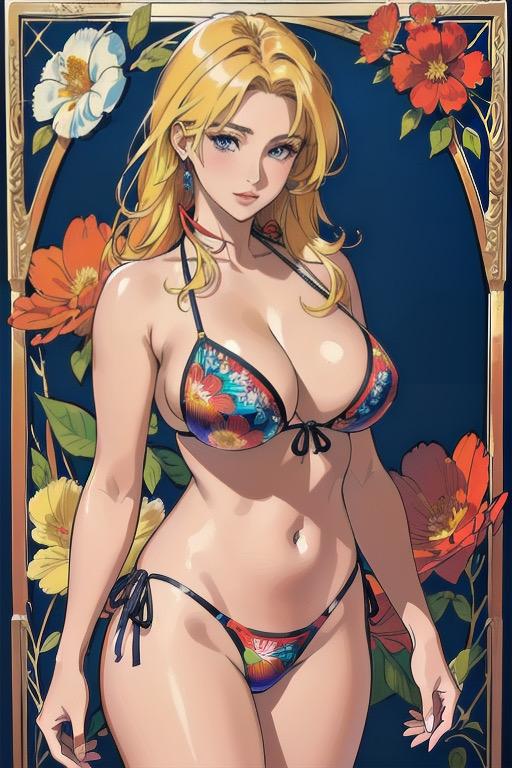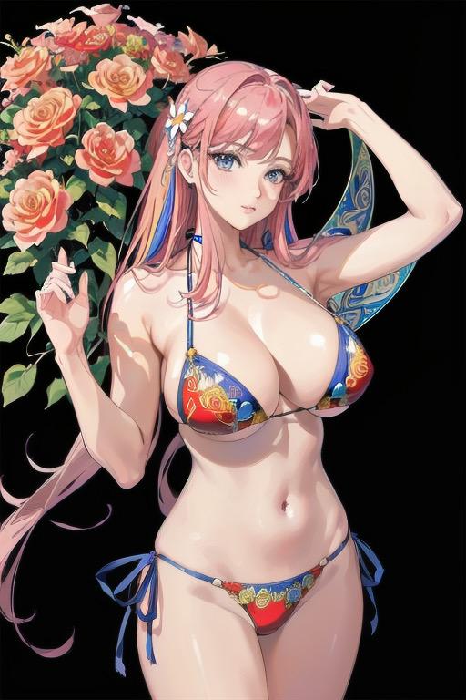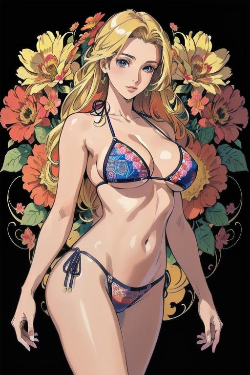 ビキニ姿の美女以外にも、花模様の背景にも注目して頂けると嬉しいです。