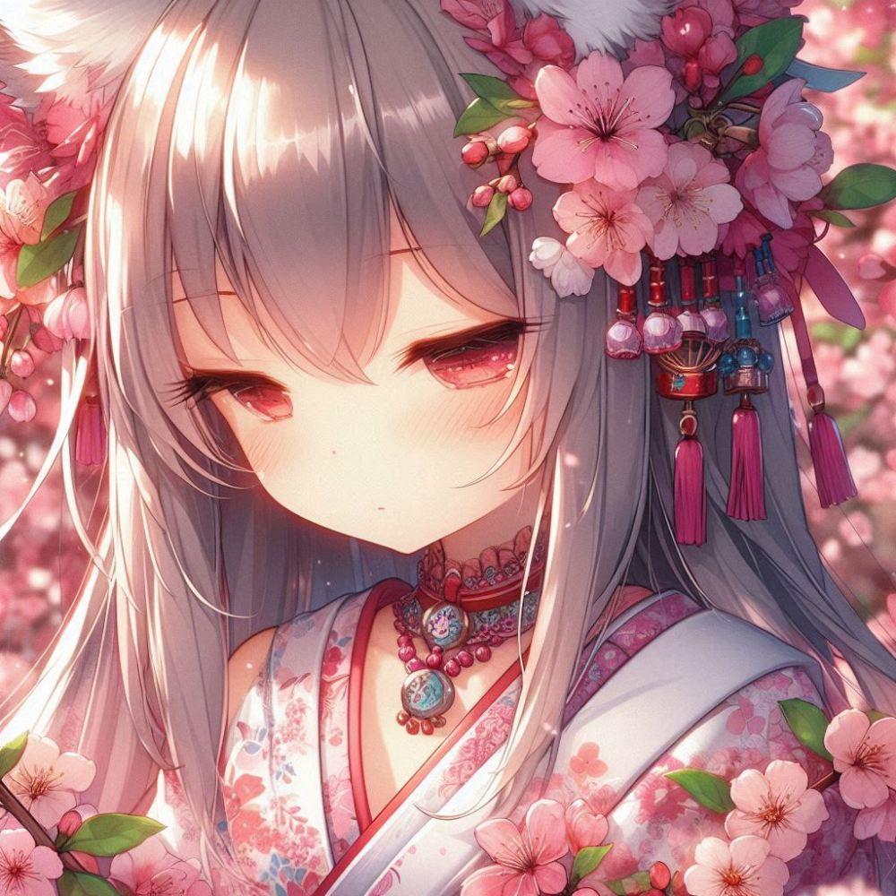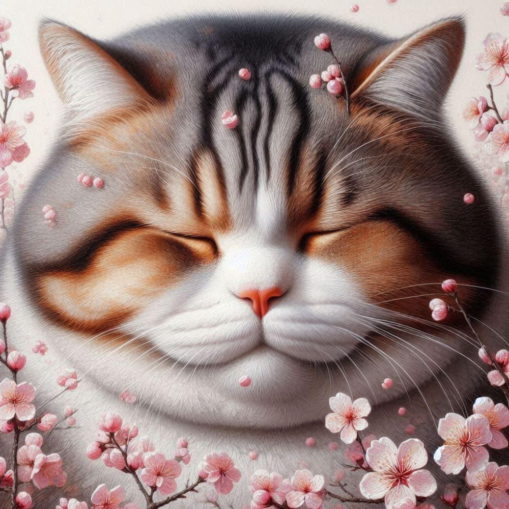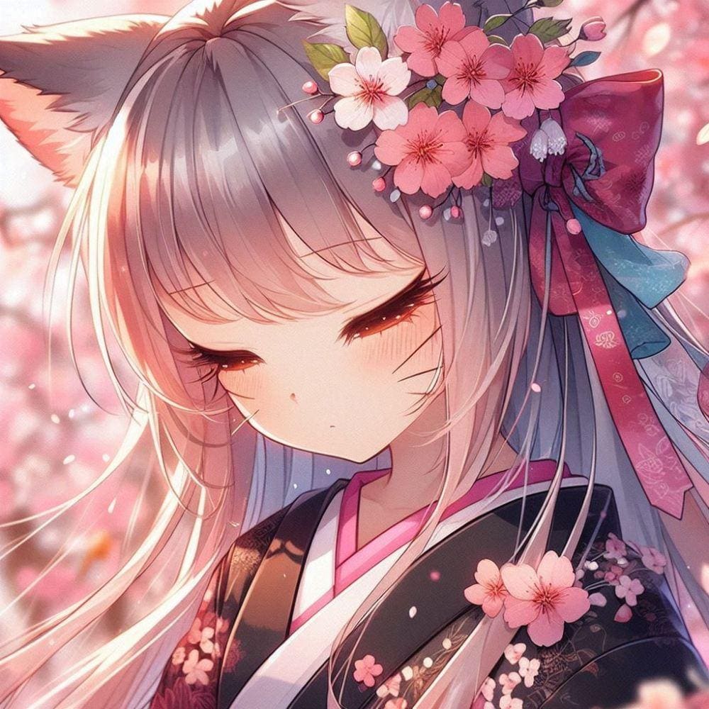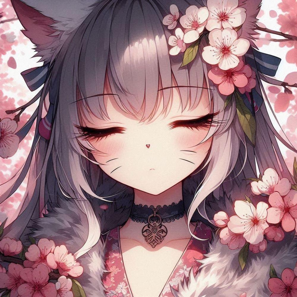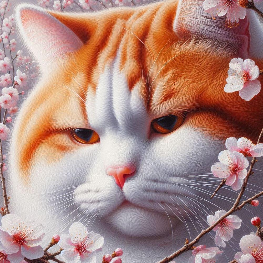 アニメ油絵風、春桜の伏し目猫娘&猫