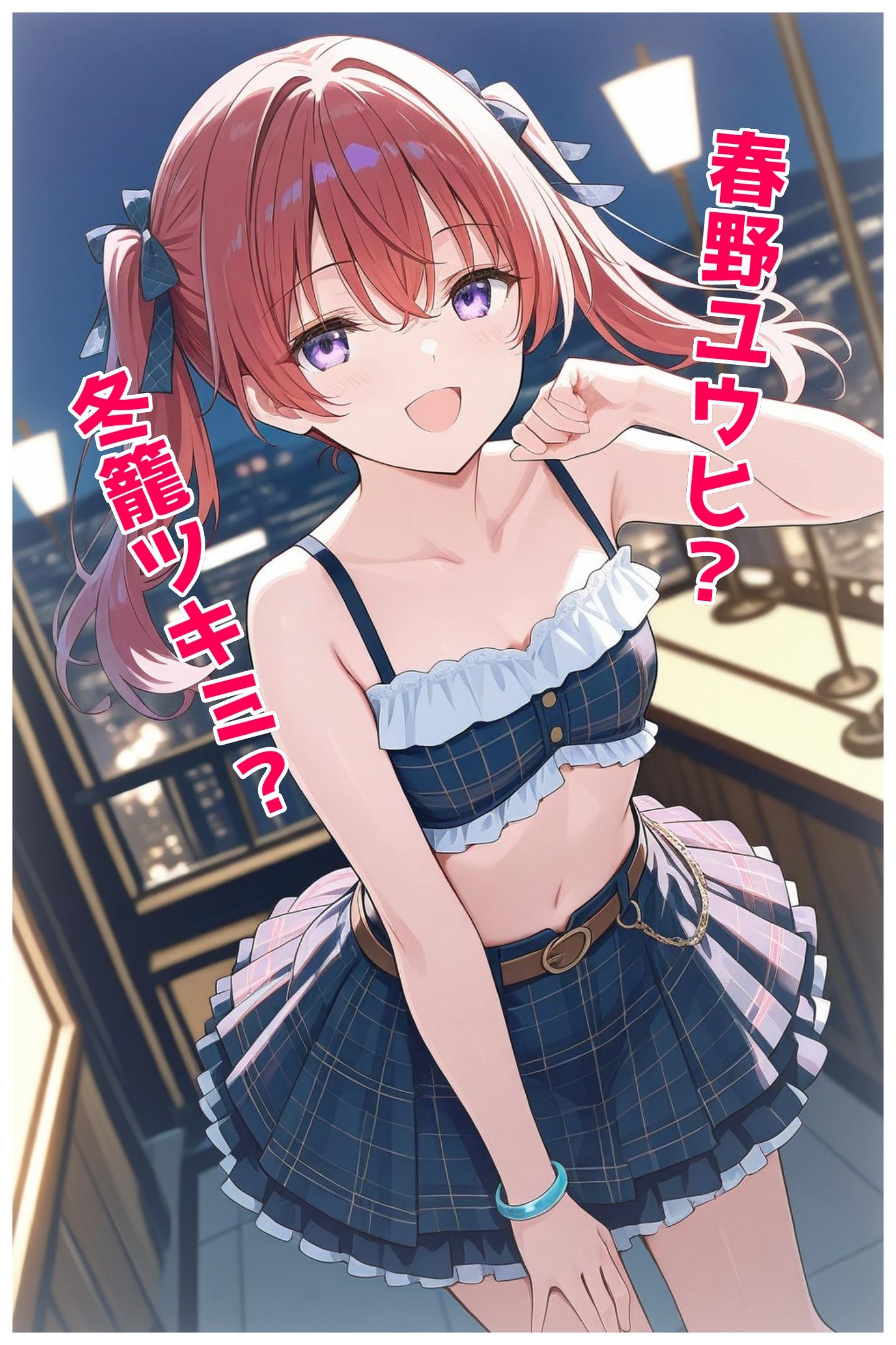 春野ユウヒ(本人)朝、冬籠ツキミ(春野ユウヒコスプレ)夕日、夜が揃った結果となって、UNICORNモデルはランダムガチャでは、ツインテール、紫の瞳を生成するのが好きなんだなと、UNICORN先生の趣向が分かり興味深いなと本作を通して感じました(о´∀`о)