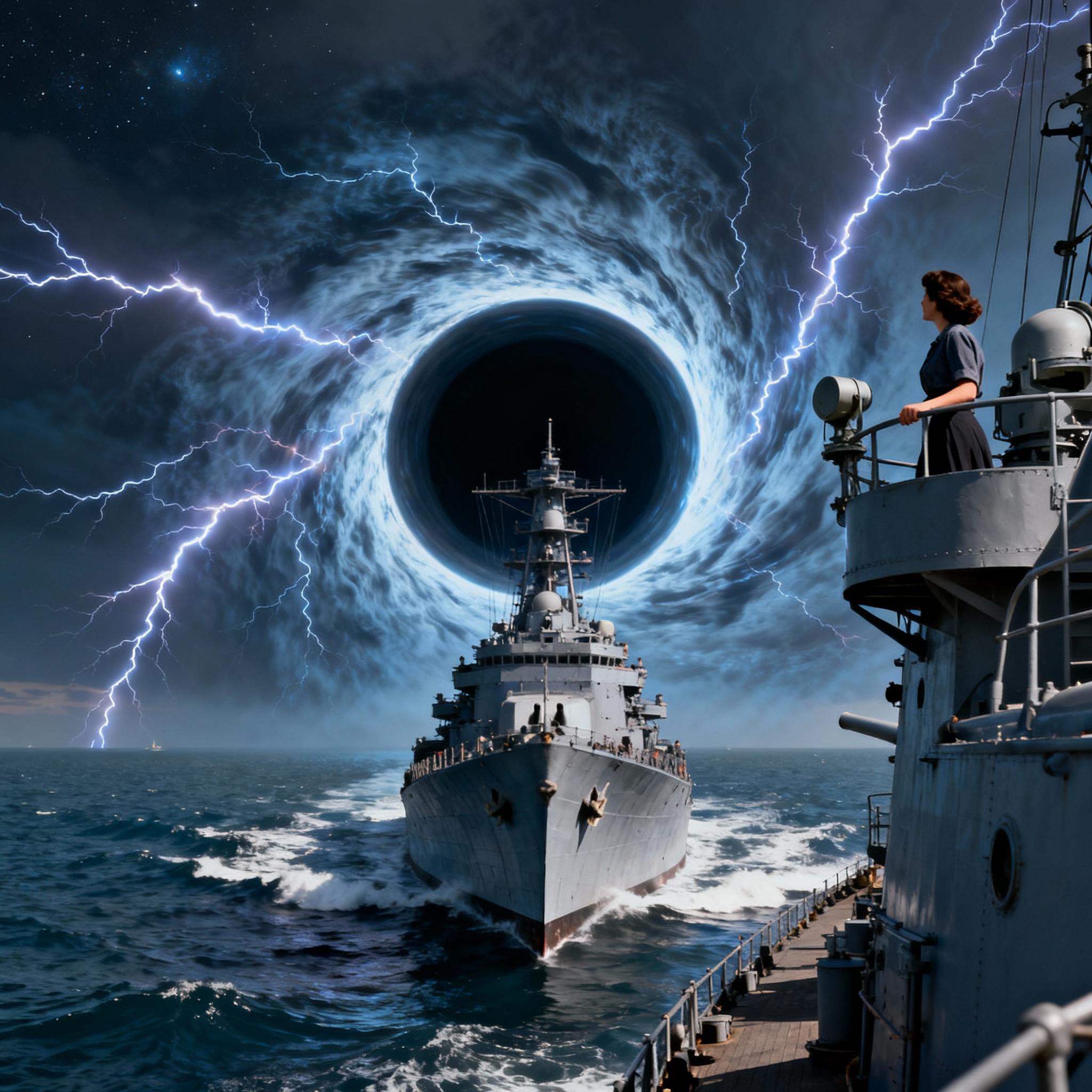 さて、プロンプトコーナー。今回はSD3 Large 3.5で行きました。駆逐艦エルドリッジの背後でブラックホールの様に時空が歪んでいるというシチュエーションを描いたのですが思いの外、良い感じで描いてくれました。
