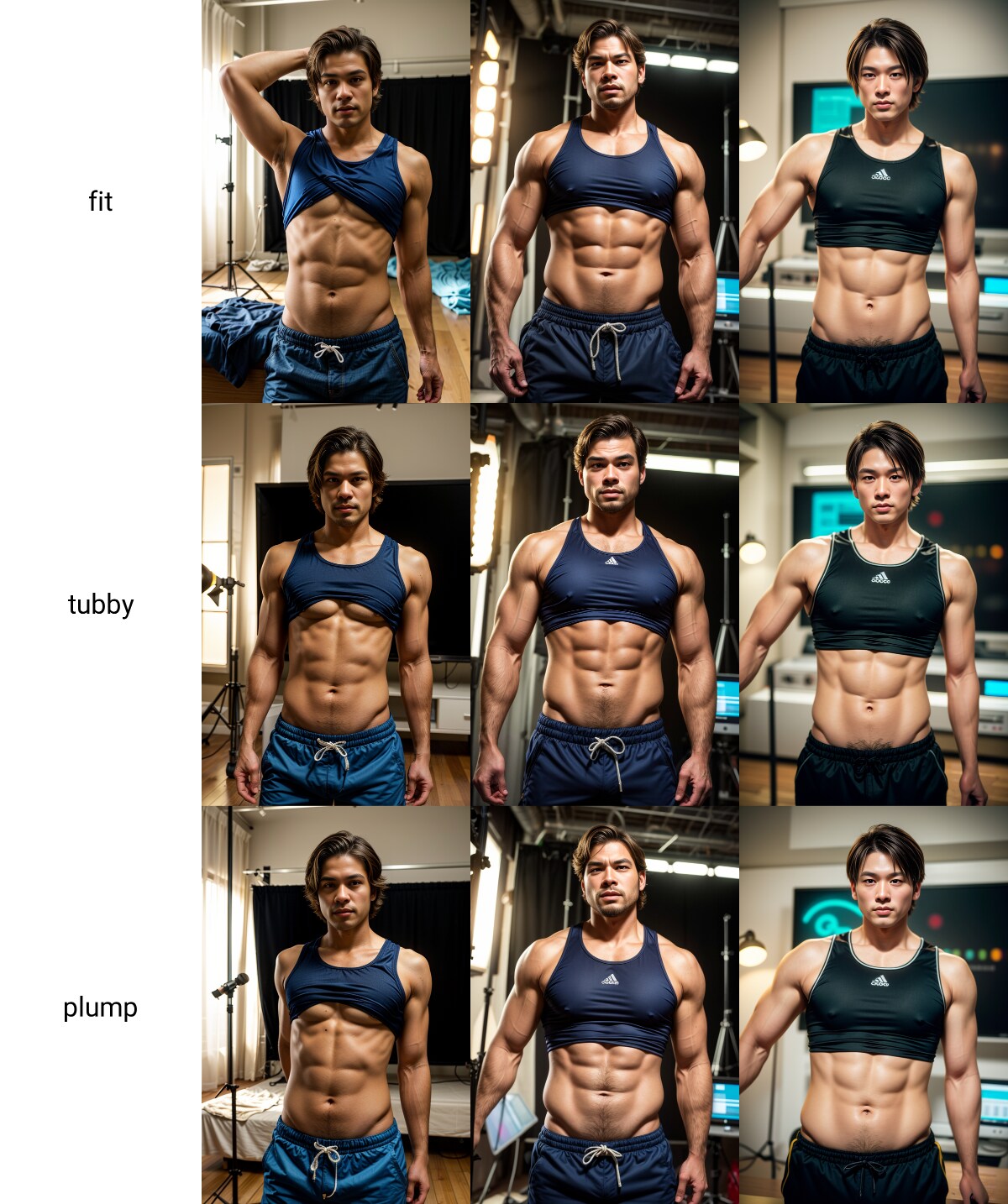 ・slender - tubbyまでの差は微妙ですね。どれを使っても痩せ型は出るようです。強いて言えば腹筋も貧相気味なslenderが一番痩せて見えますかねー