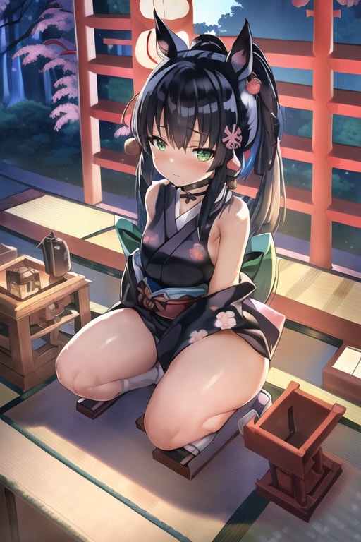 黒色、ウマの耳、黒の和装、桃源郷、しゃがむ
