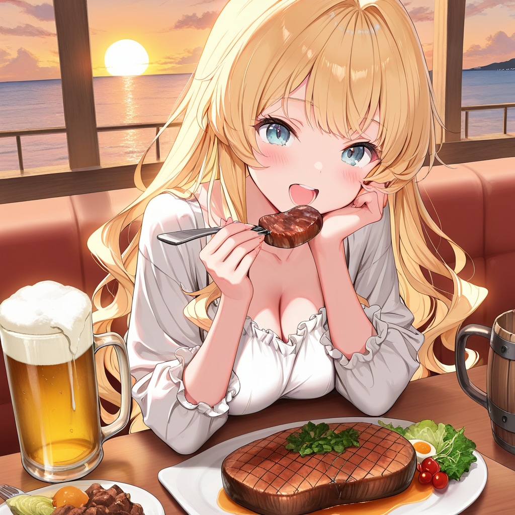 作者「ステーキよりもビールでお腹いっぱいにしそう…」