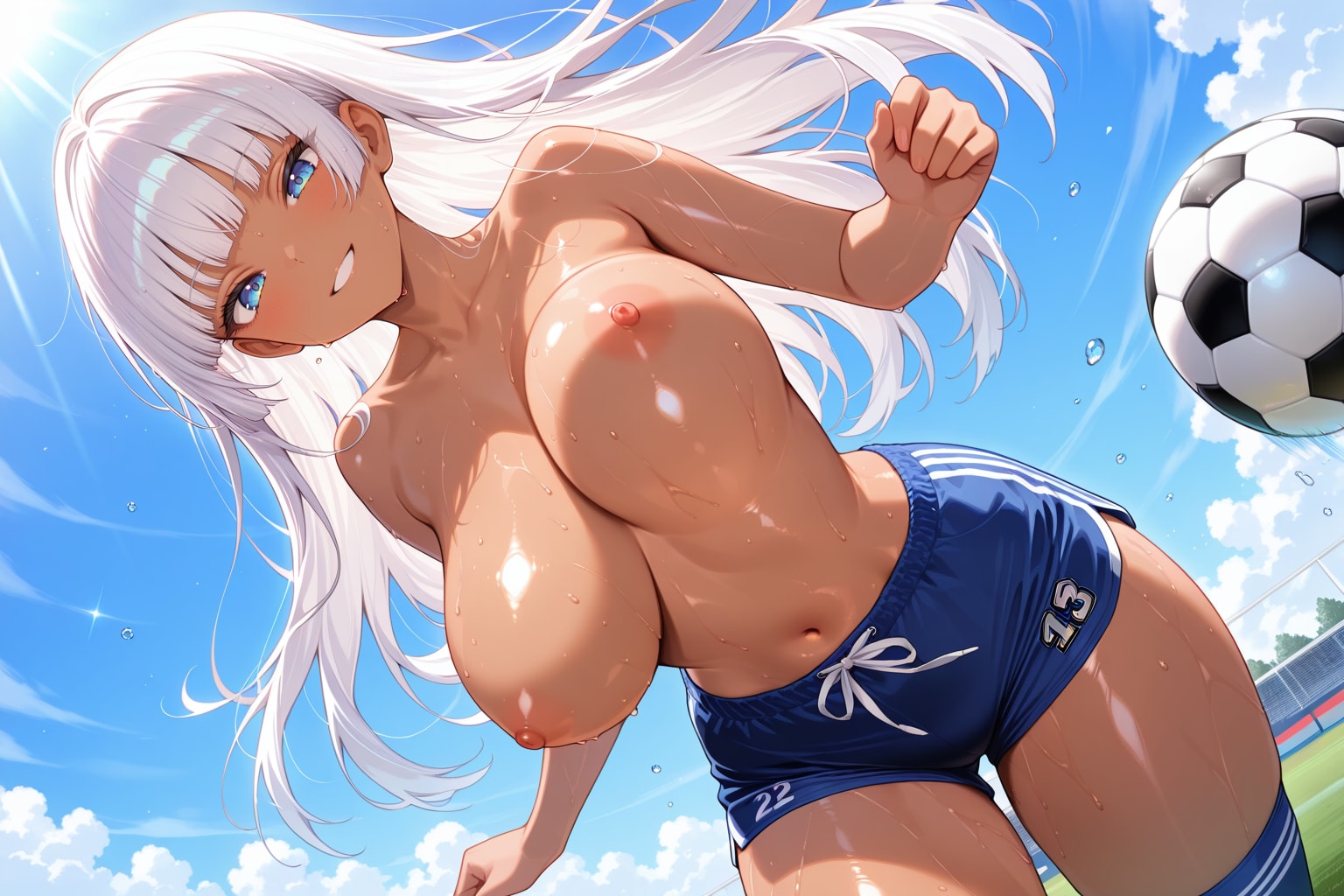 今回のシーン設定は、上半身裸の少女が広々としたサッカー場でフットボールをプレイする様子。汗に濡れた素肌が太陽の光を浴びて妖しく輝きを放ち、豊満な胸の曲線が鮮やかに浮かび上がる。躍動的な動きが、青春の奔放な活力と情熱を鮮烈に体現している。