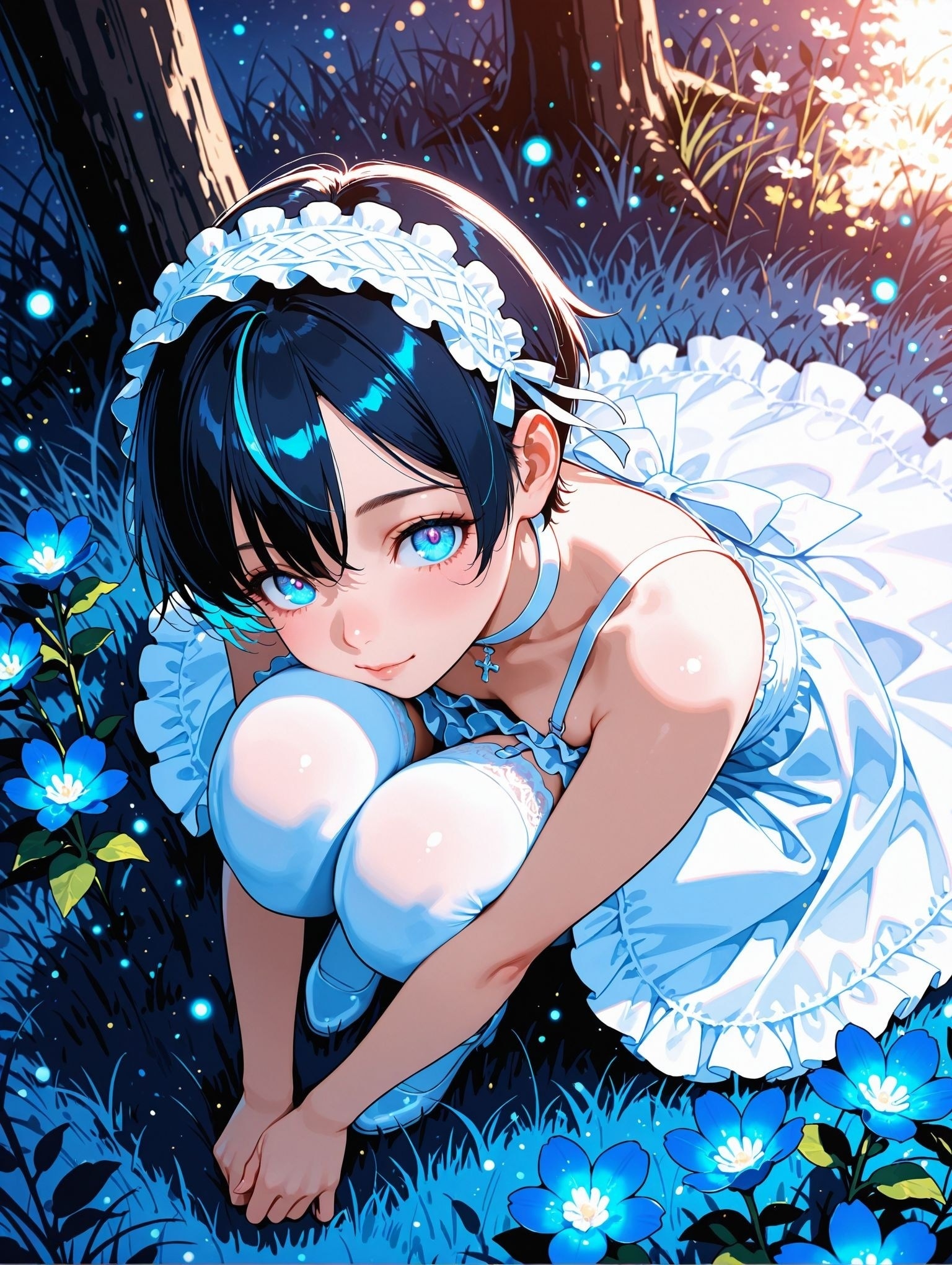 夜の青光が彼女をそっと包む。