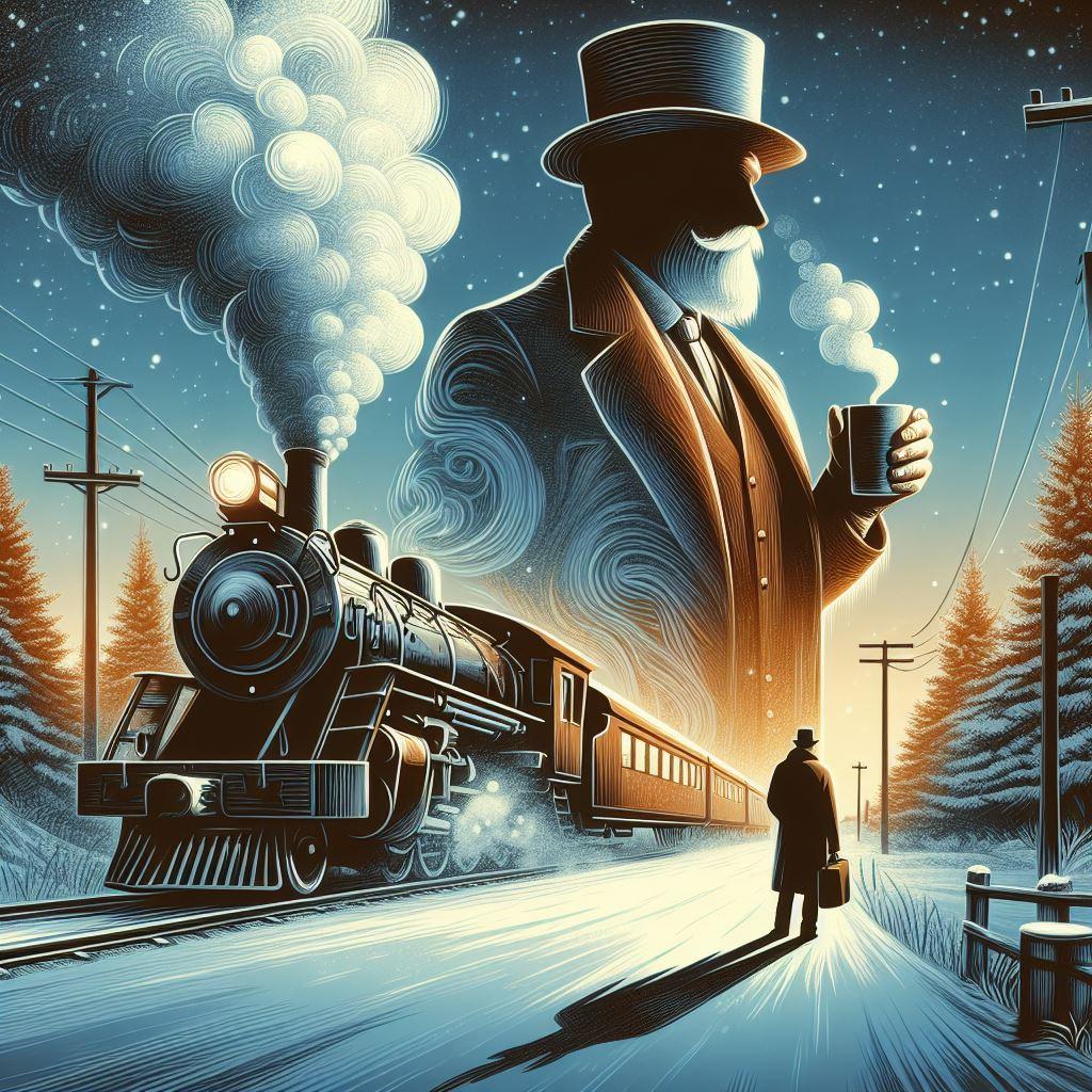機関車とコーヒーを飲む人と、雪道を歩く人の絵です