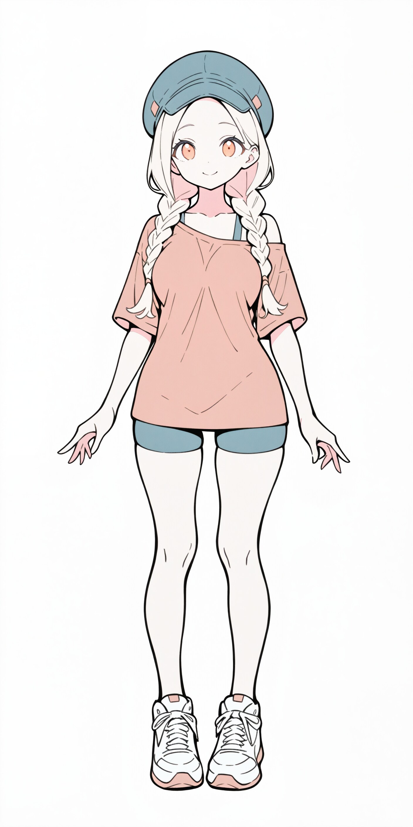 (01) 2025秋 :Beige twin braids, orange eyes tareme, forehead, large breast, slim body, denim cap, single-shoulder long shirt, baggy red shirt, bra strap, bike shorts under shirt