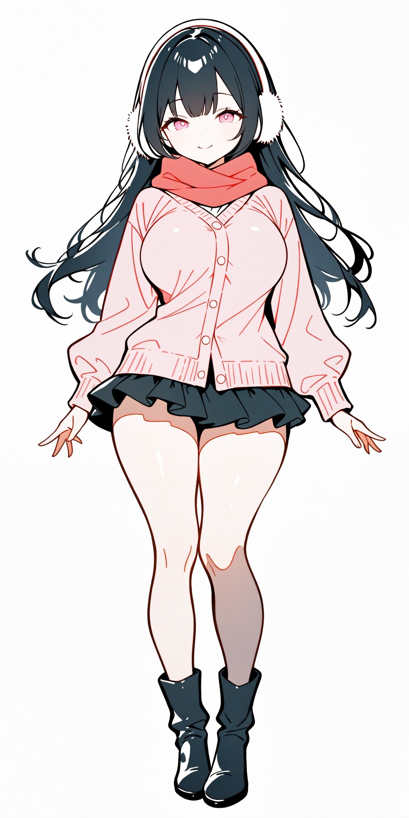 (04) 2024冬:black long hair, half-closed eyes, pink eyes, red scarf, huge breasts, pink cardigan, earmuffs, mini skirt