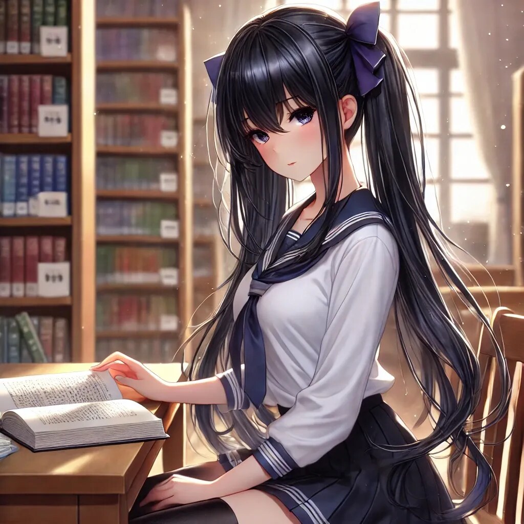 放課後の図書室で静かに本を読む、黒髪ツインテールの女子高生。背が高く大人びた体型で、落ち着いた雰囲気の中に知的な美しさが漂っています。