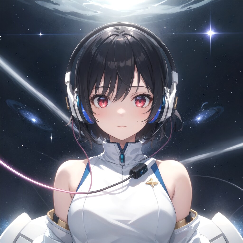 ヘッドホンが星の音を拾い、彼女の周囲に星屑の旋律を描く。