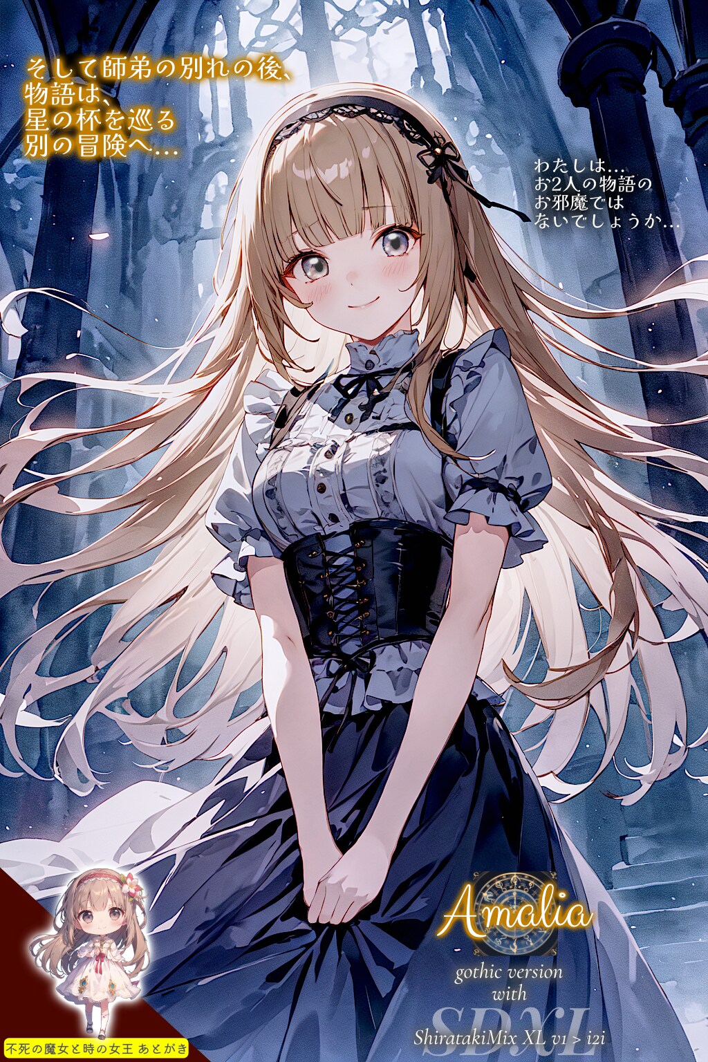 アマーリアのゴシックなバージョン モデル:ShiratakiMixXL v1でアプスケなし→i2iでHimawraiMix v9で強度0.3+さらに加工