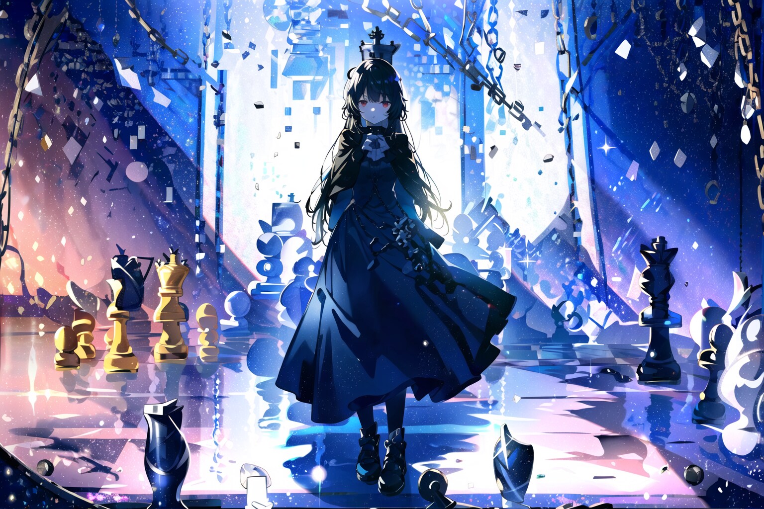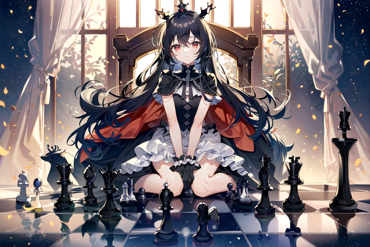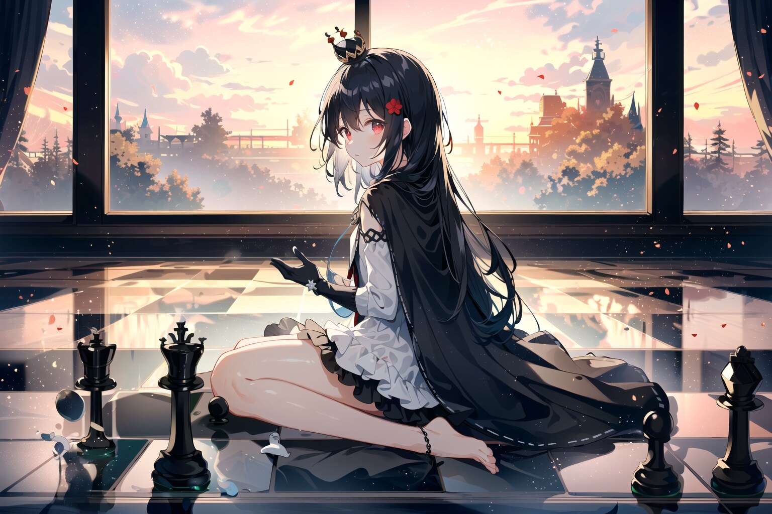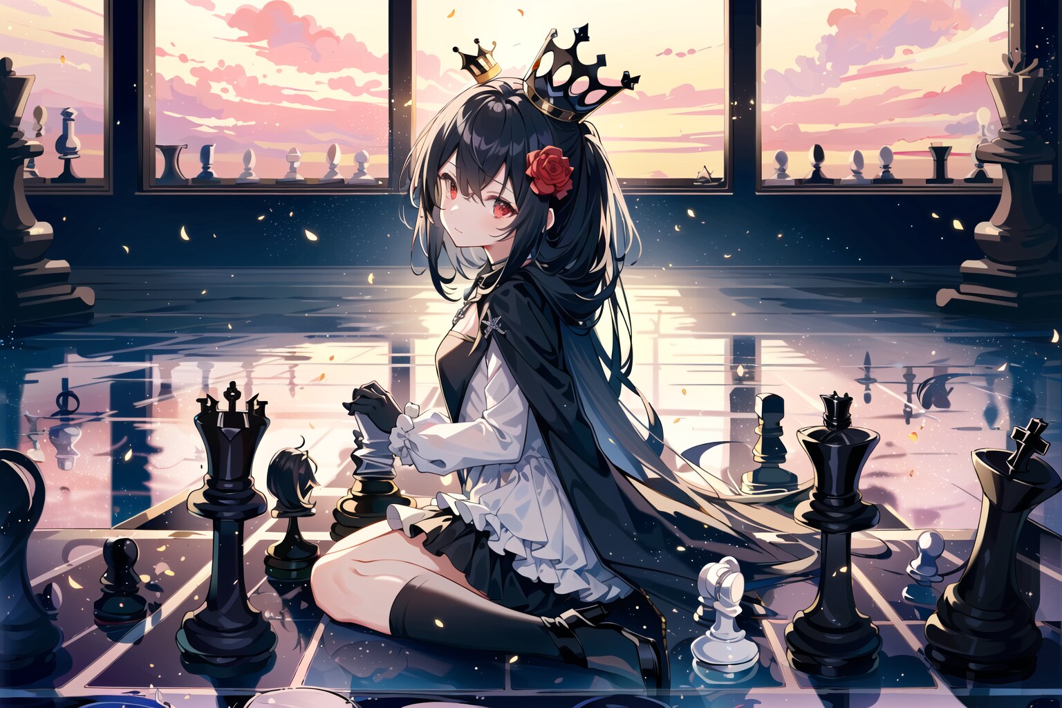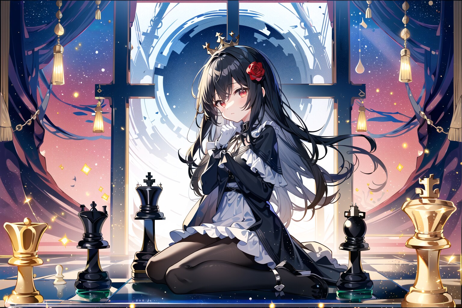 (chess piece, chess board, King's piece ), Queen's piece , Bishop's piece, Rook's piece, Knight's piece , Pawn' piece <lora:lightAndShadow_v10:0.5> , window from starry,strry light,night,star \(sky\), (dust particles:1.2)