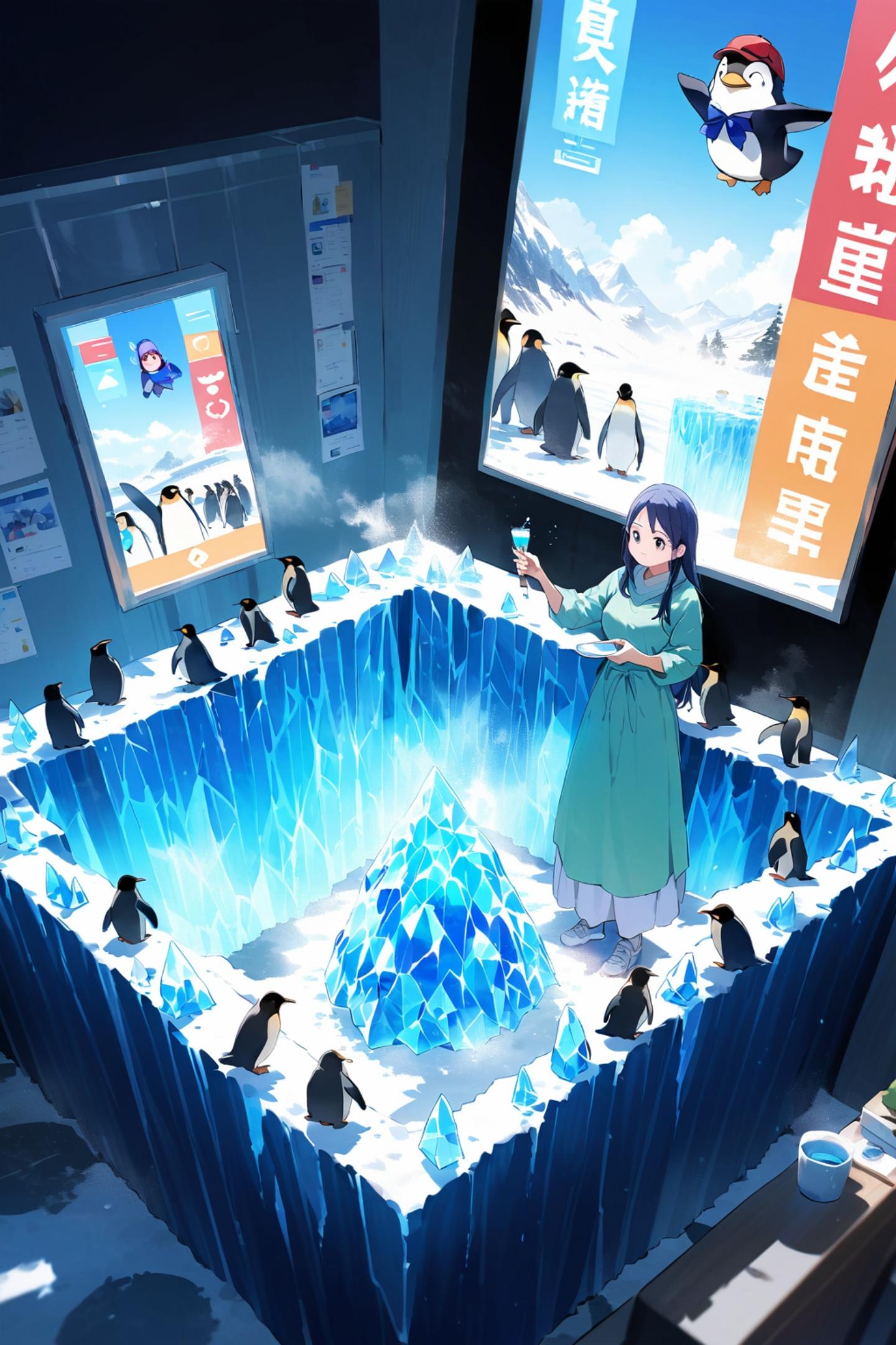 氷を操るウンコのイラスト。ペンギンは銀色のトイレを身にまとい、冷たい青い光を放つウンコを持っている。トイレには氷の結晶のような模様が施され、ペンギンの周りには氷の柱や霧が立ち込めている。ペンギンには凛々しい表情を浮かべ、片手でウンコのように氷を操りながら、冷気を纏った姿が描かれている。背景には凍りついた人々やテレビ局が広がる。