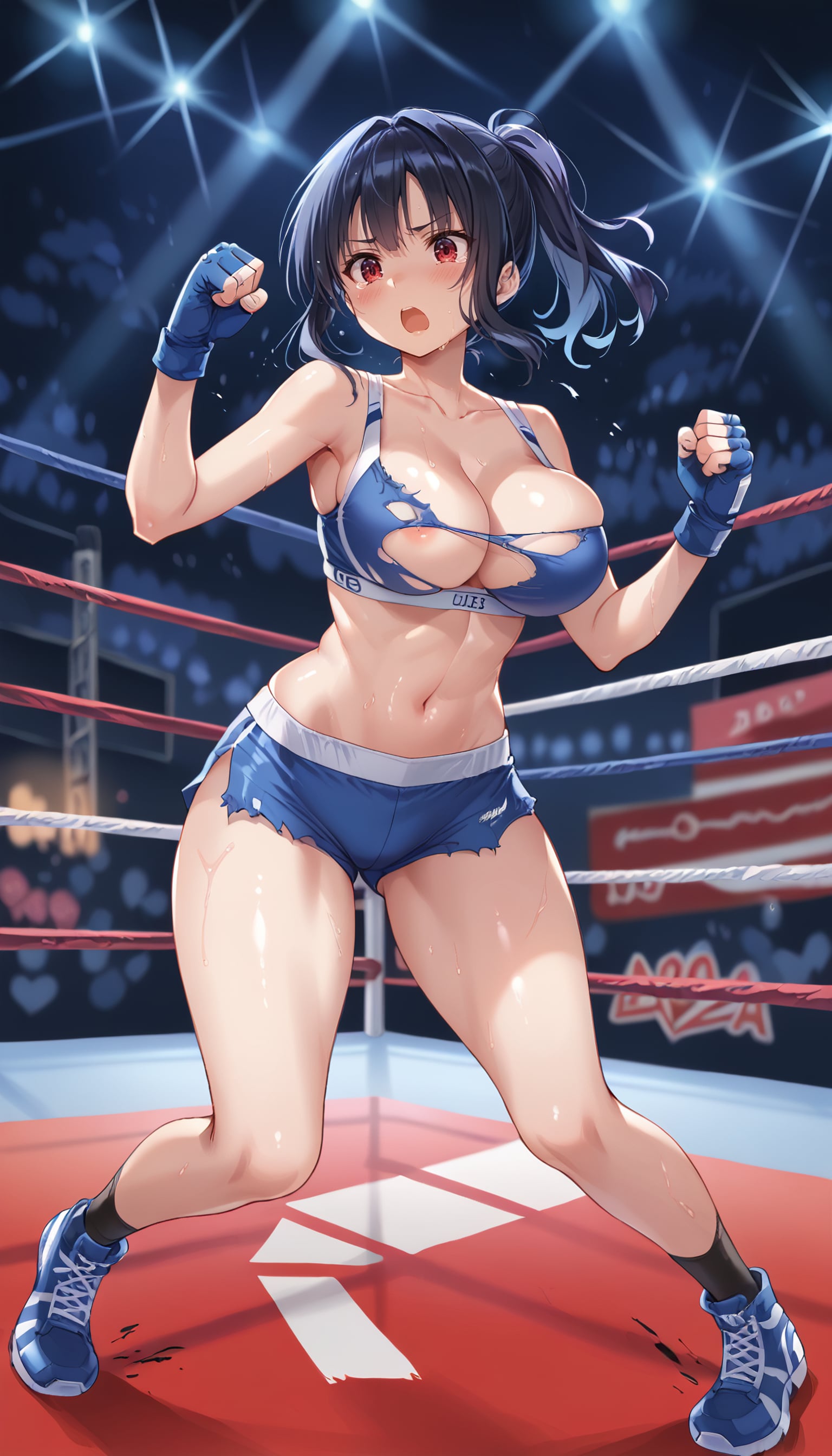 彼女の受けたダメージを物語るかのように、身に付けているスポーツブラの布地が裂ける。汗で透けた肌と、その下にあるたわわな果実が露わになり、観客たちは歓声を上げる。